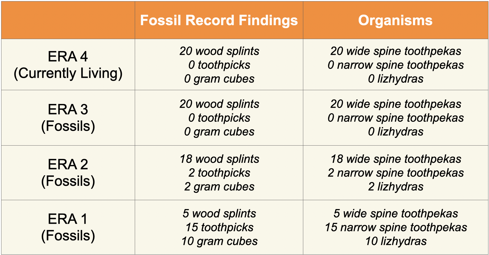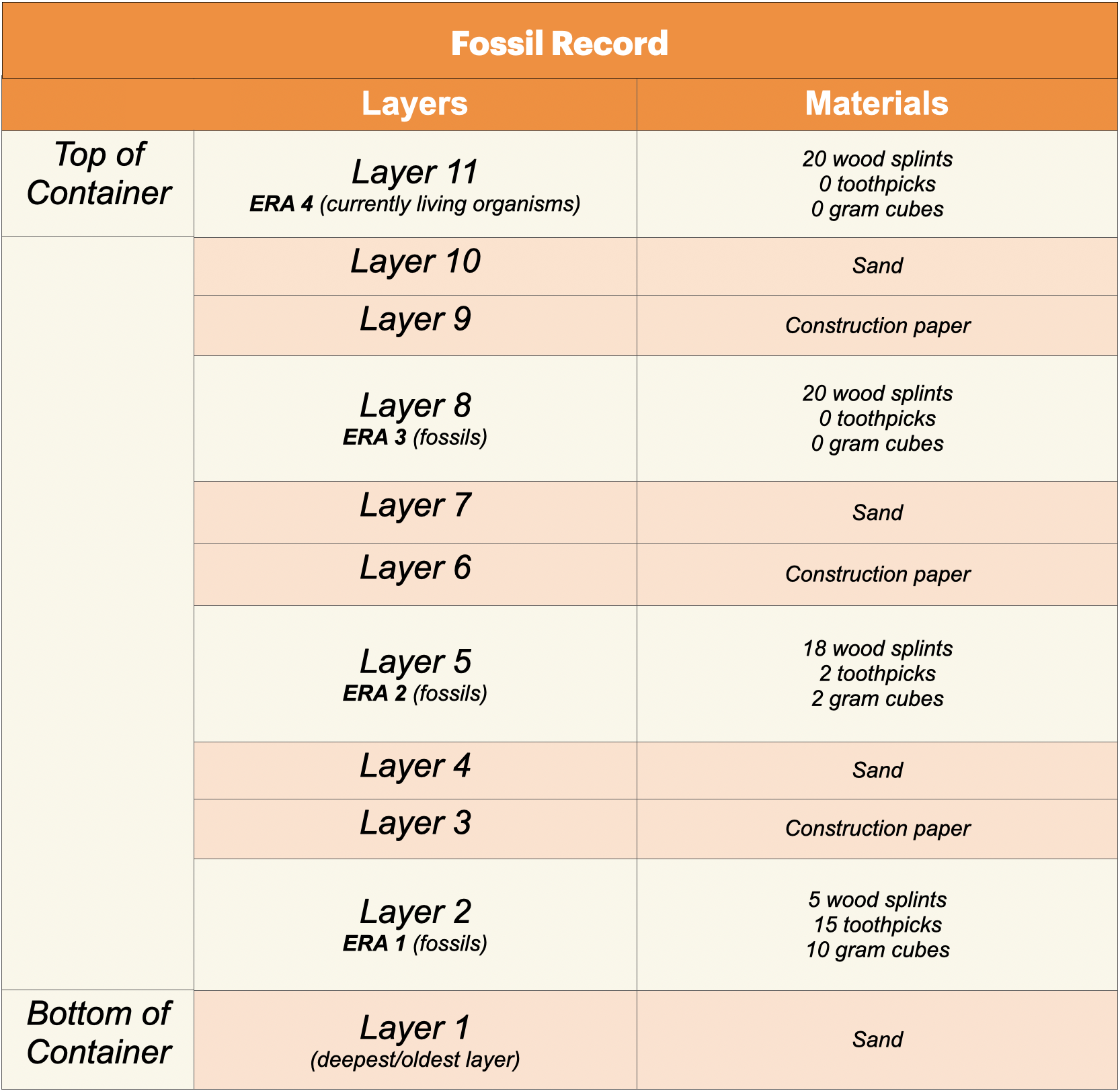 - Use the clear plastic container and other materials to build a “fossil record” for each student group. Use the table below to aid in building the fossil record. Begin building from the bottom of the container.