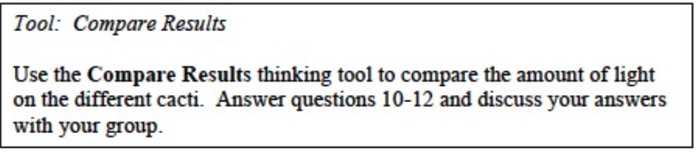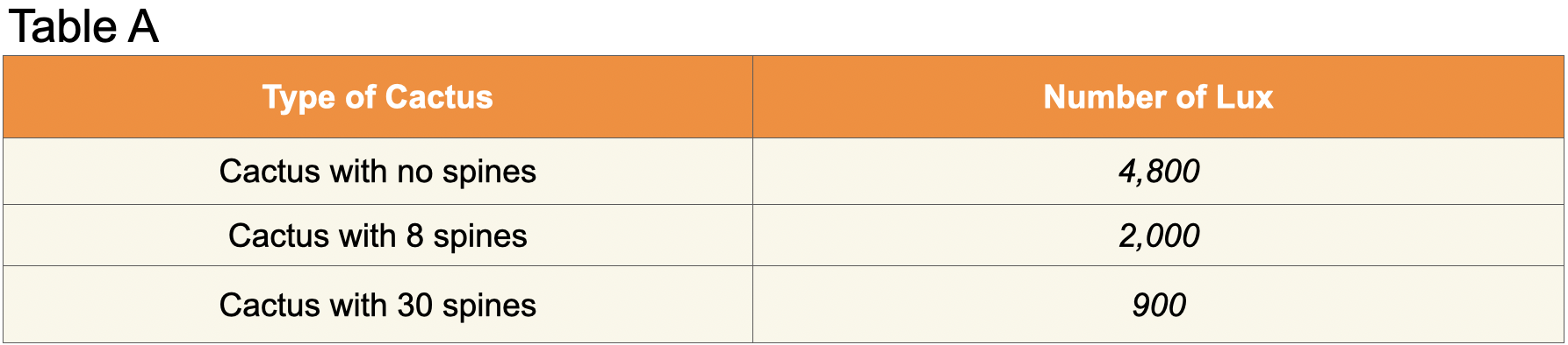 F. Record: How much light falls on the cactus when there are more spines? Record the amount of light in Table A.