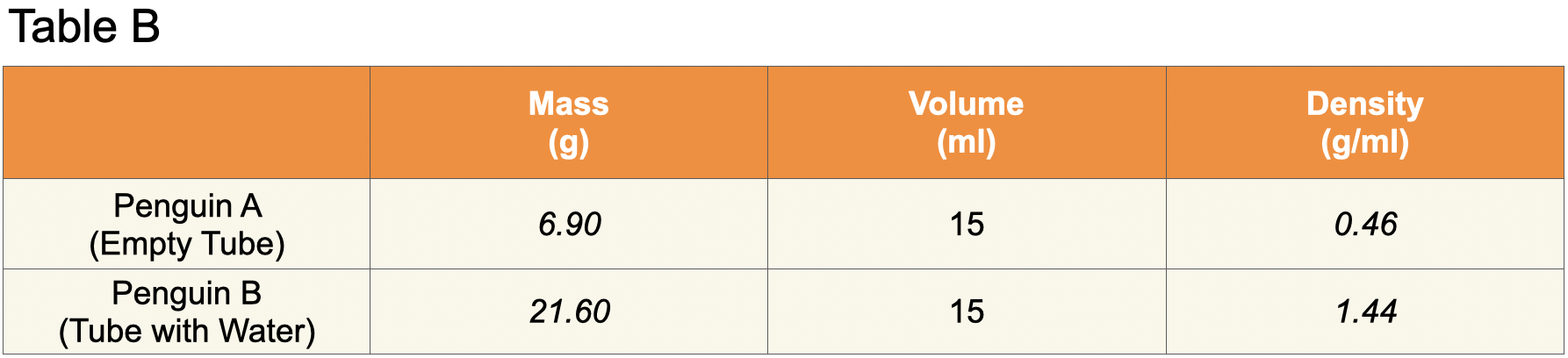 12. Which penguin floated lower in the water? The falcon tube filled with water, Penguin B.
