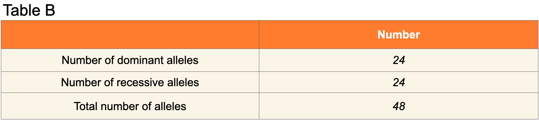 B. Record: Count the total number of dominant alleles (less dense bones) in the penguin population by counting the number of dark-colored gram cubes. Write this number in Table B.