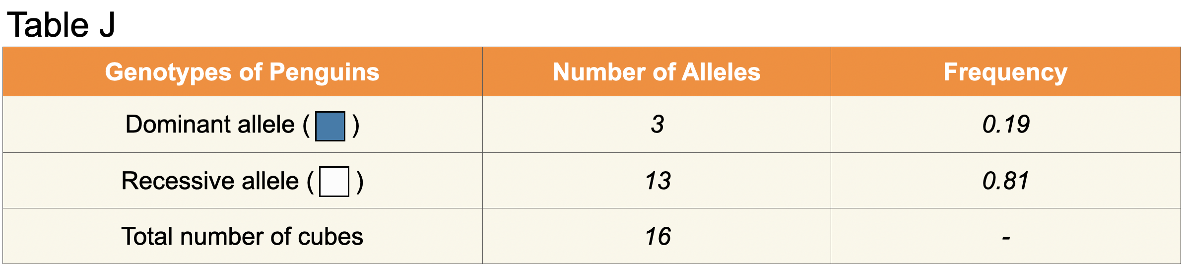 C. Count the total number of recessive alleles (light-colored gram cubes) and record them in Table J.