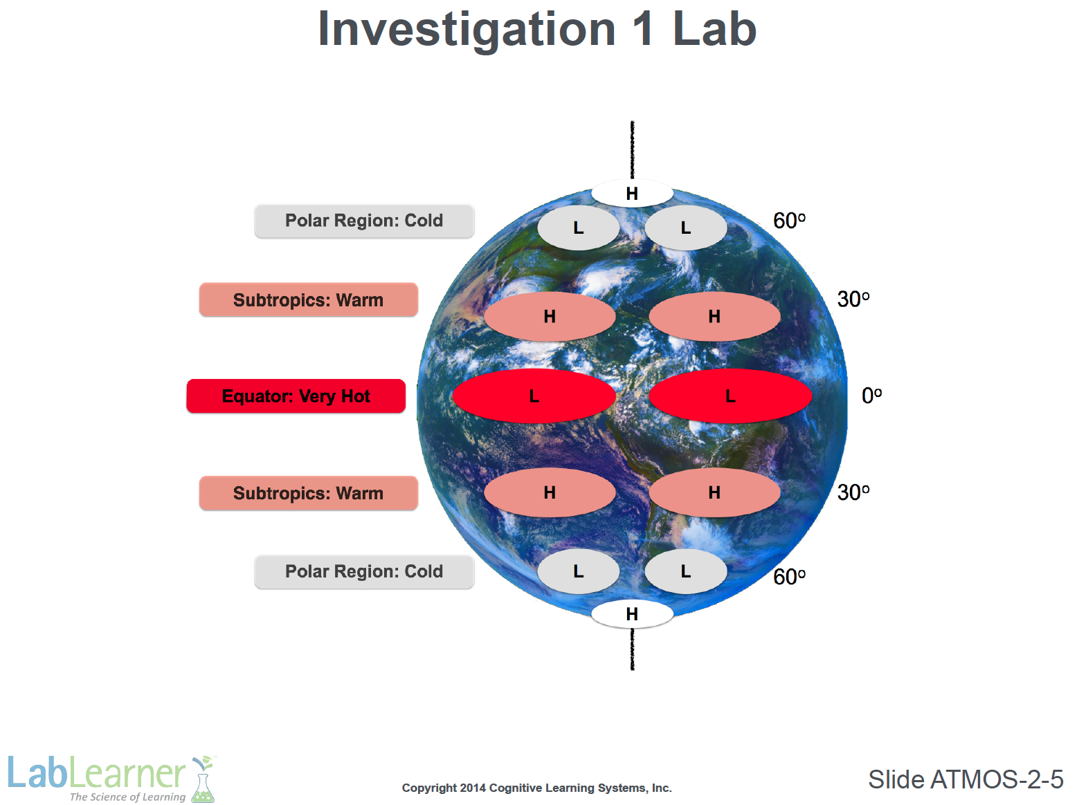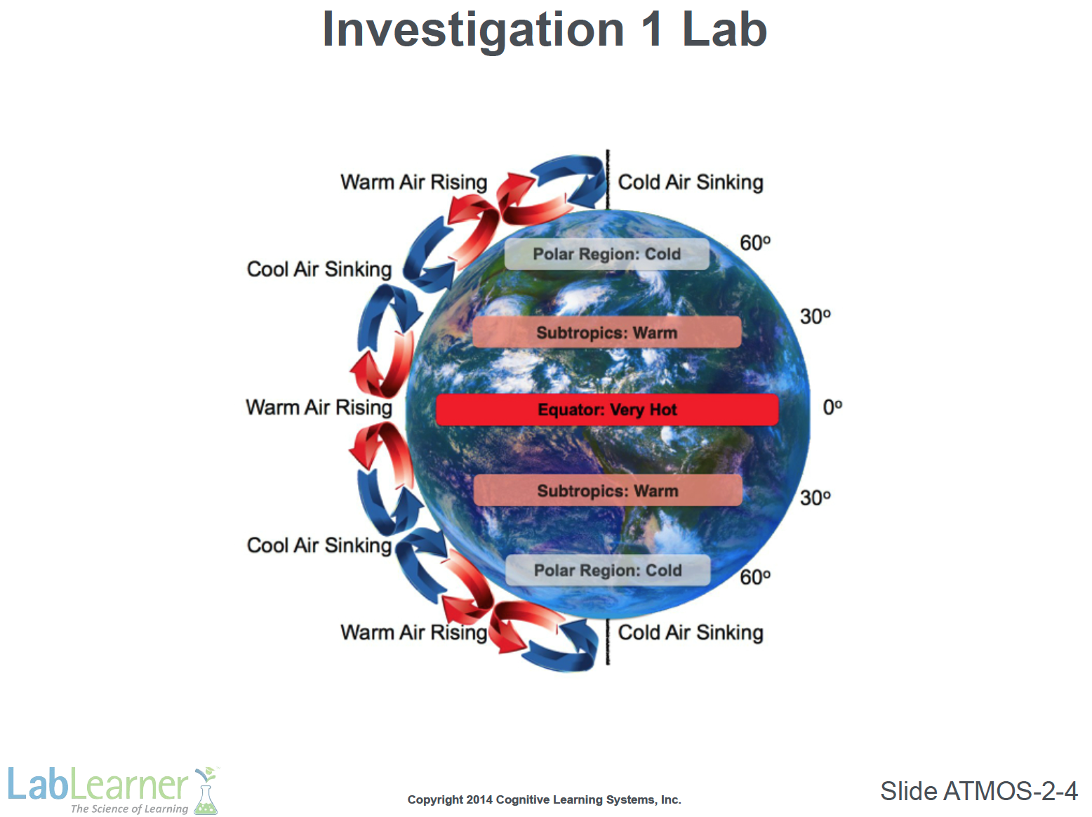 - We have seen this slide before, in Investigation 1, where differential heating of the Earth’s surface by the sun and the Coriolis Effect sets up major global convection systems.