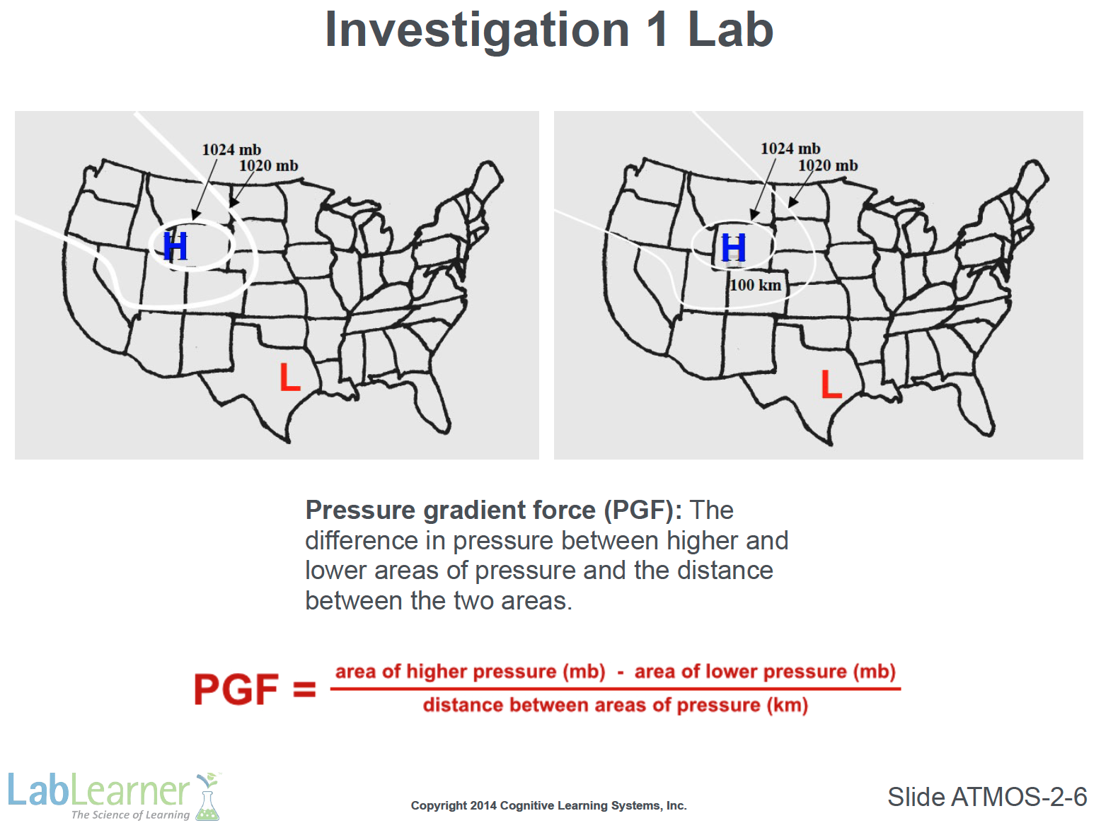 - The map on the right shows not only the magnitude of the millibar lines but the distance between them as well. The Pressure Gradient Force (PGF), which takes into account both the difference in pressure between higher and lower areas of atmospheric pressure (millibar lines) and the distance between them, determines the strength of the winds likely to be associated with various locations on the map. PGF is calculated according to the formula: