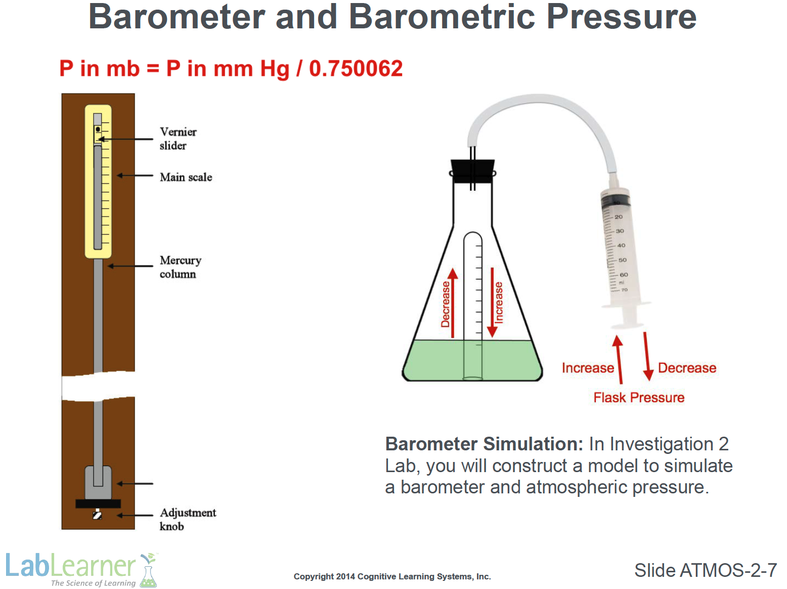 - The figure on the right side of this slide illustrates the barometer simulation that students will construct in the second part of Investigation 2 Lab. It is a good illustration of how a barometer works.