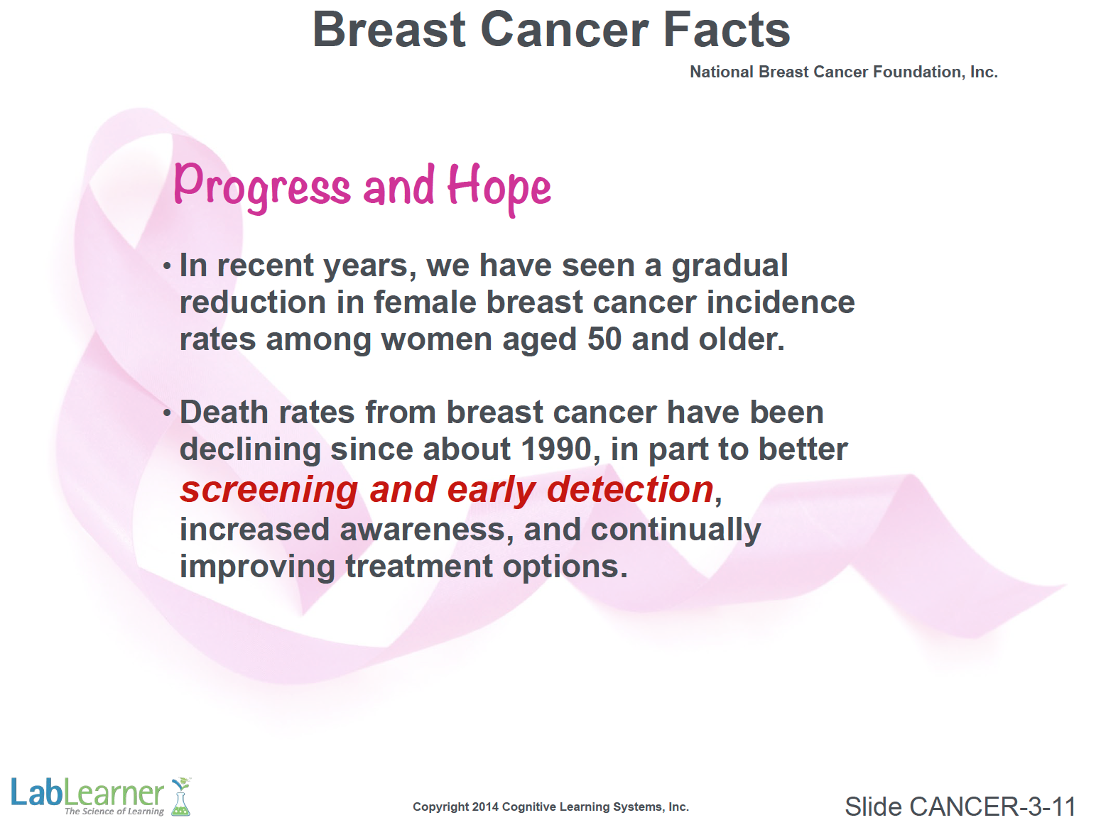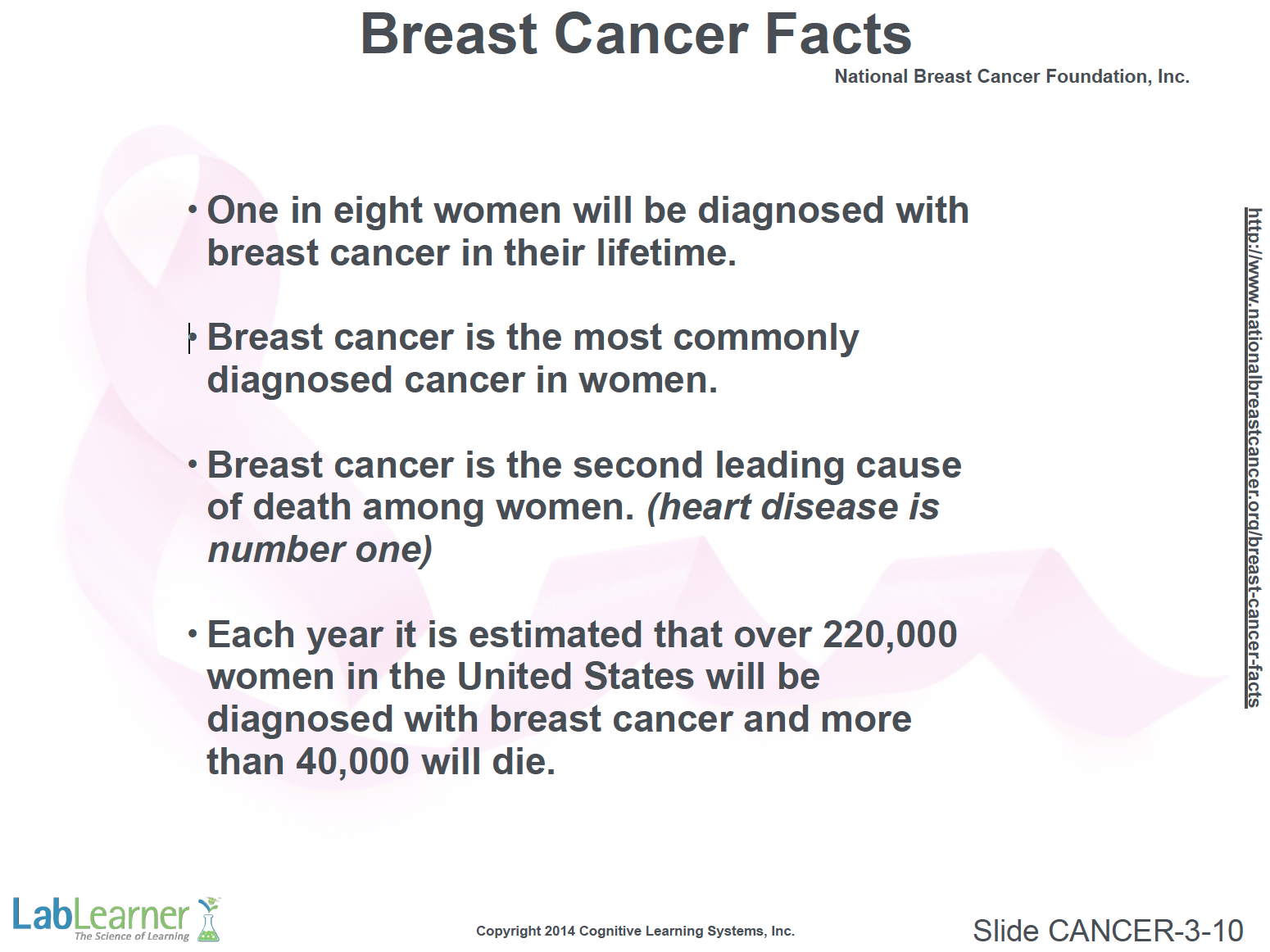 - Breast cancer facts. There are many excellent sites on the Internet to learn more about breast cancer. Statistical information for this slide and the next, for example, were obtained from the National Breast Cancer Foundation, Inc. website.