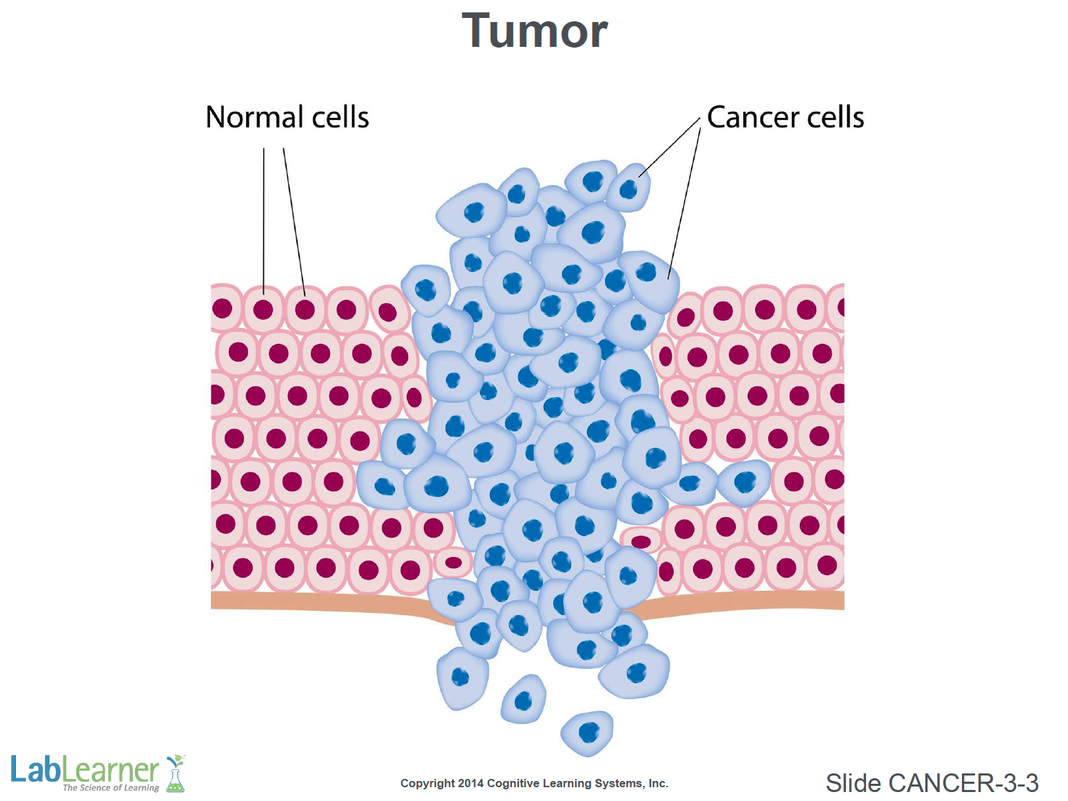 - When cell cycle control is lost, contact inhibition may no longer prevent cells in a tissue to stop dividing and a tumor can form (the blue cells in this slide). Obviously, this mass of abnormal cells can alter the function of the organ in which it is found.