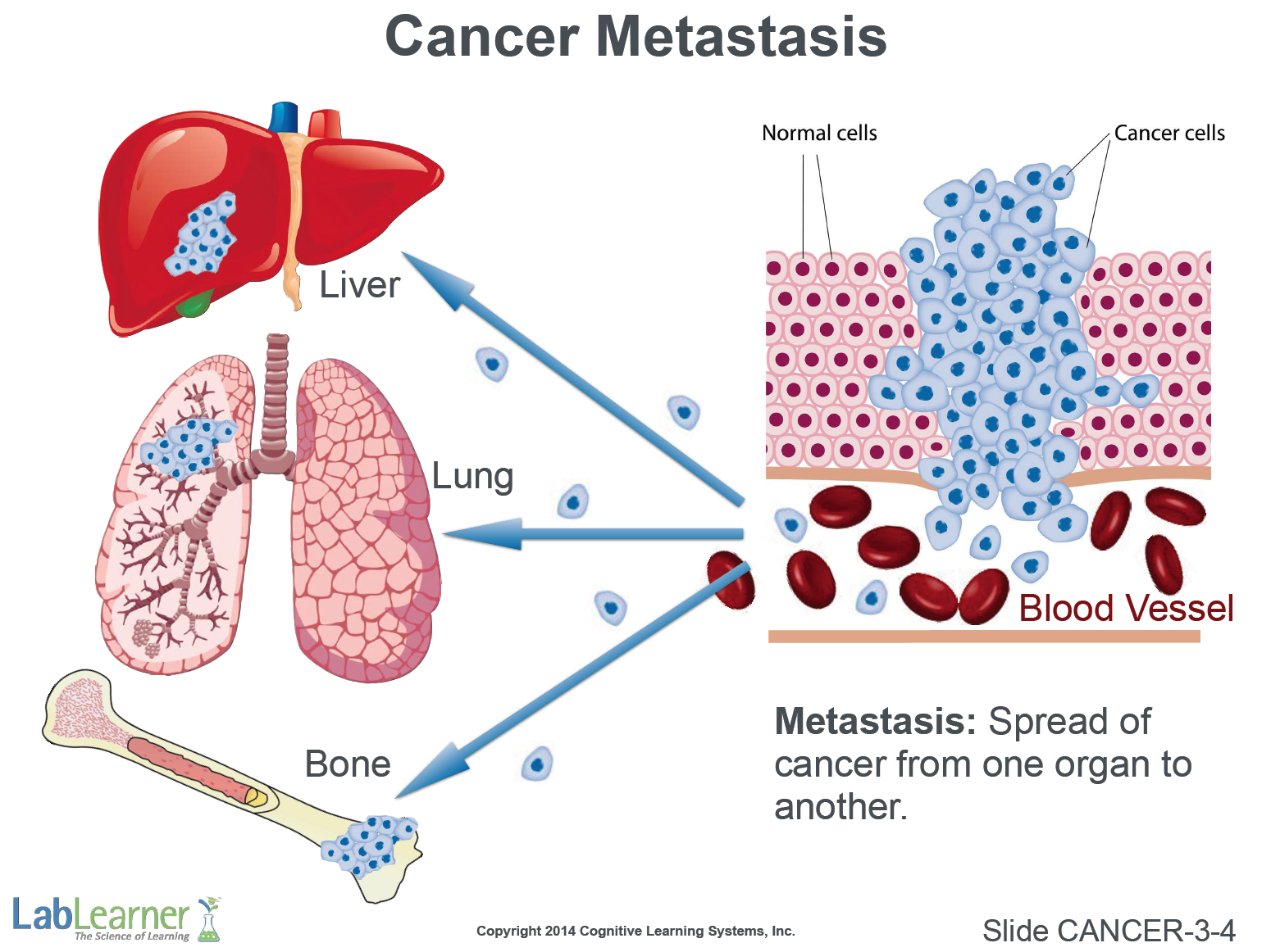 - In this slide, cells from the primary tumor are transported to the liver, lung, and bone. Once arriving at these various tissues, metastasized cells may continue to divide and form new tumors in the target organs.