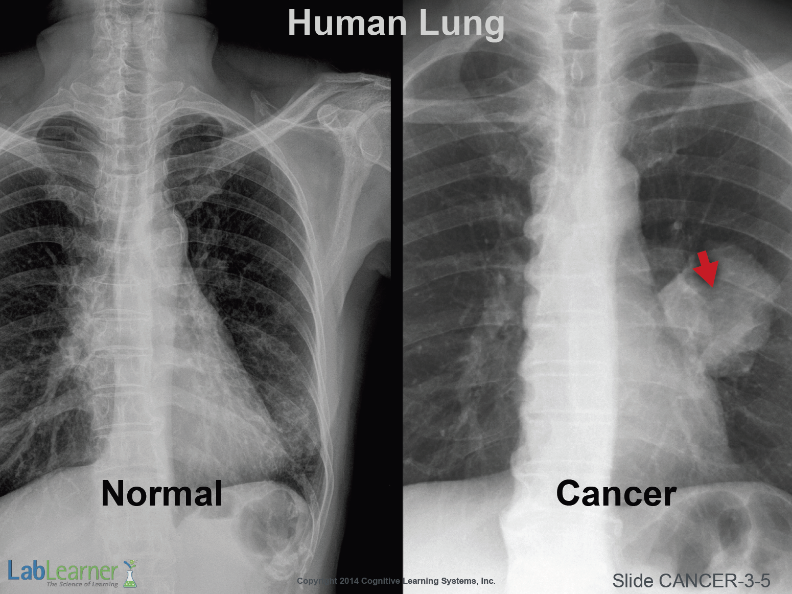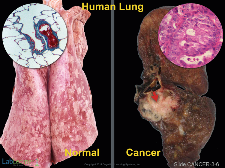 - This slide shows specimens of a normal human lung and a human lung with a rather large tumor (indicated by the red arrow). In addition, the round inserts show the microscopic image of each type of sample. These were obtained from the same slides students will view in Investigation 3 lab.
