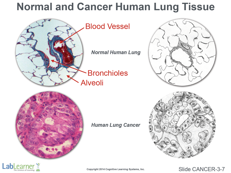- We now turn to a look at two very specific types of cancer; lung and breast cancer. Students will be able to examine both normal and cancerous examples of these human tissues in Investigation 3 lab.