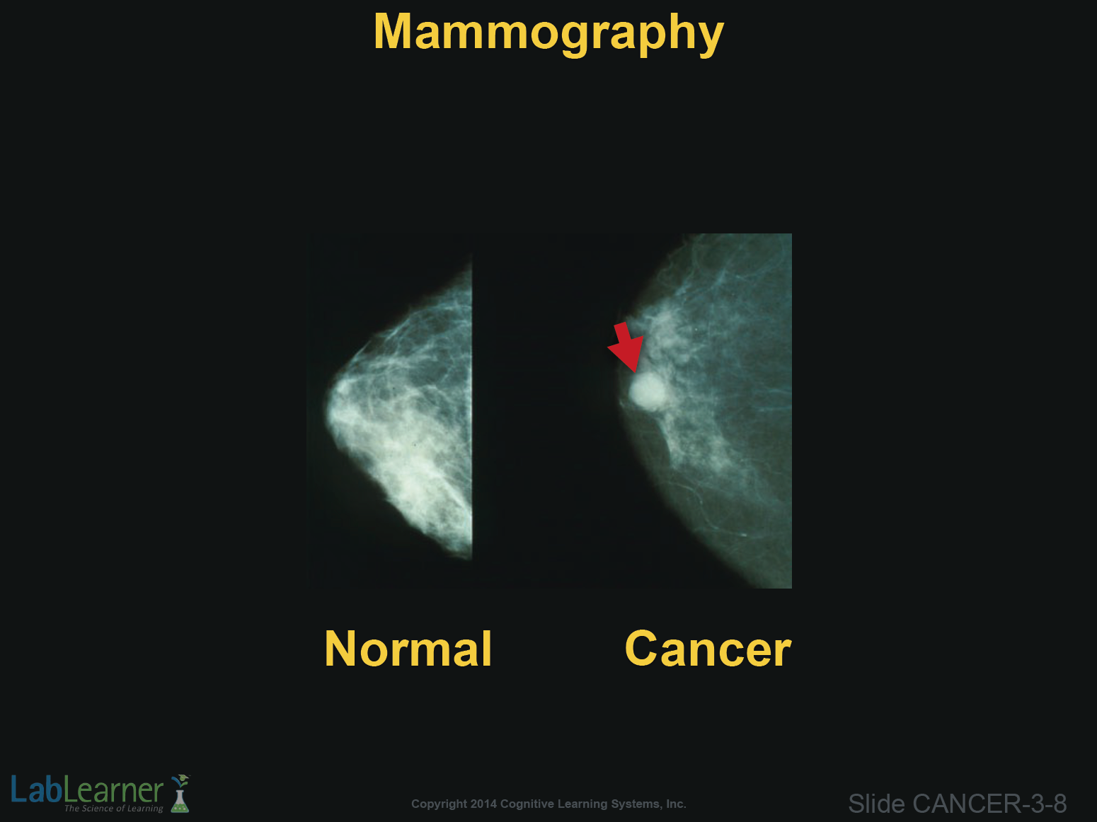 - This slide shows mammograms of a normal human breast (left) and one containing a cancerous mass (right). The red arrow indicates the breast tumor.