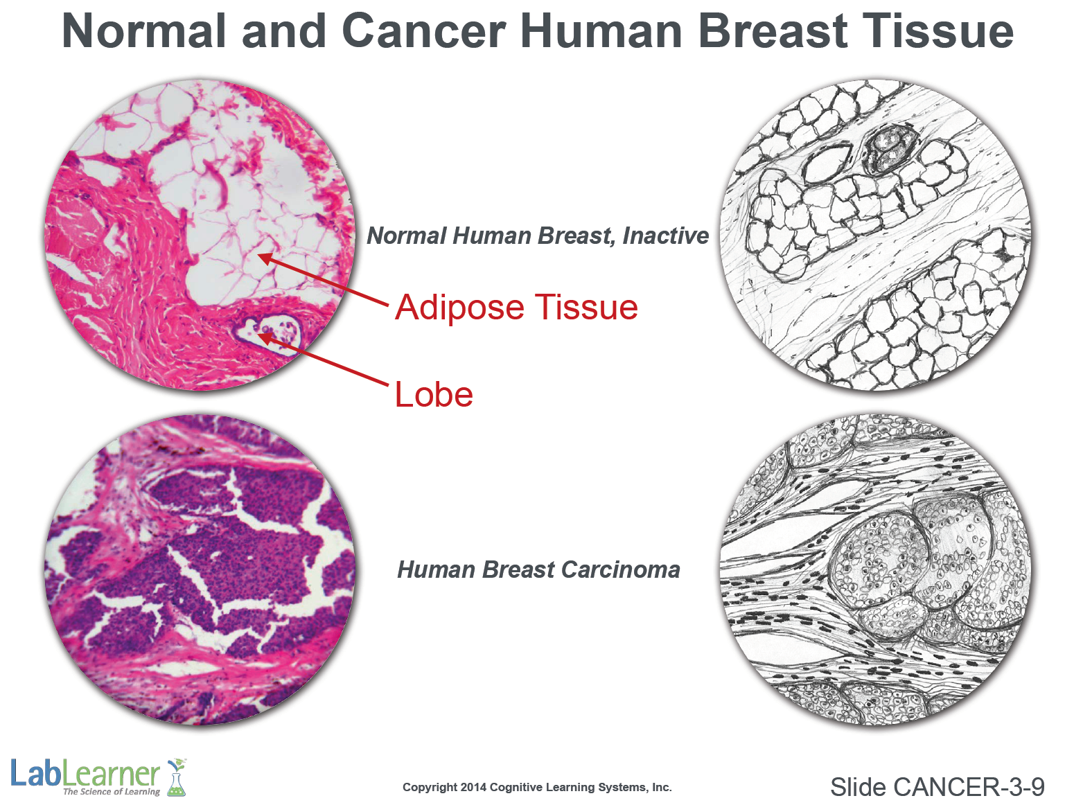 - This slide simply shows normal breast and breast cancer biopsy micrographs (left) and presents an artist’s drawing taken from each specimen (right). Students will be able to study these biopsy slides in detail in Investigation 3 lab.