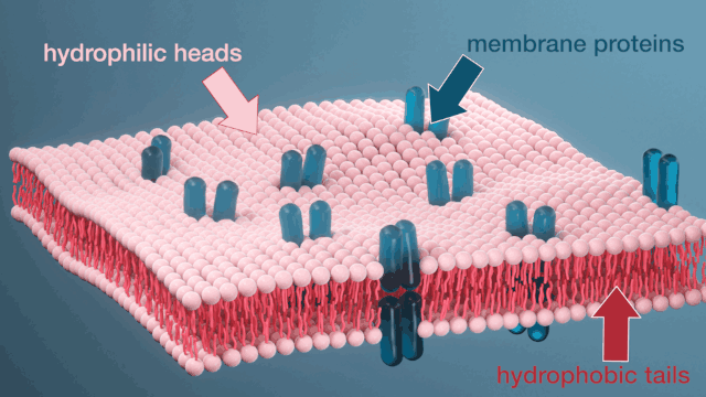 Below is an animation of a cell membrane, showing its lipid bilayer structure. The pink balls represent the polar (hydrophilic) heads of the phospholipid molecules, while the hydrophobic tails are shown in red. Also, notice the proteins (blue) that are embedded in the membrane. Membrane proteins are very important for many cellular processes.