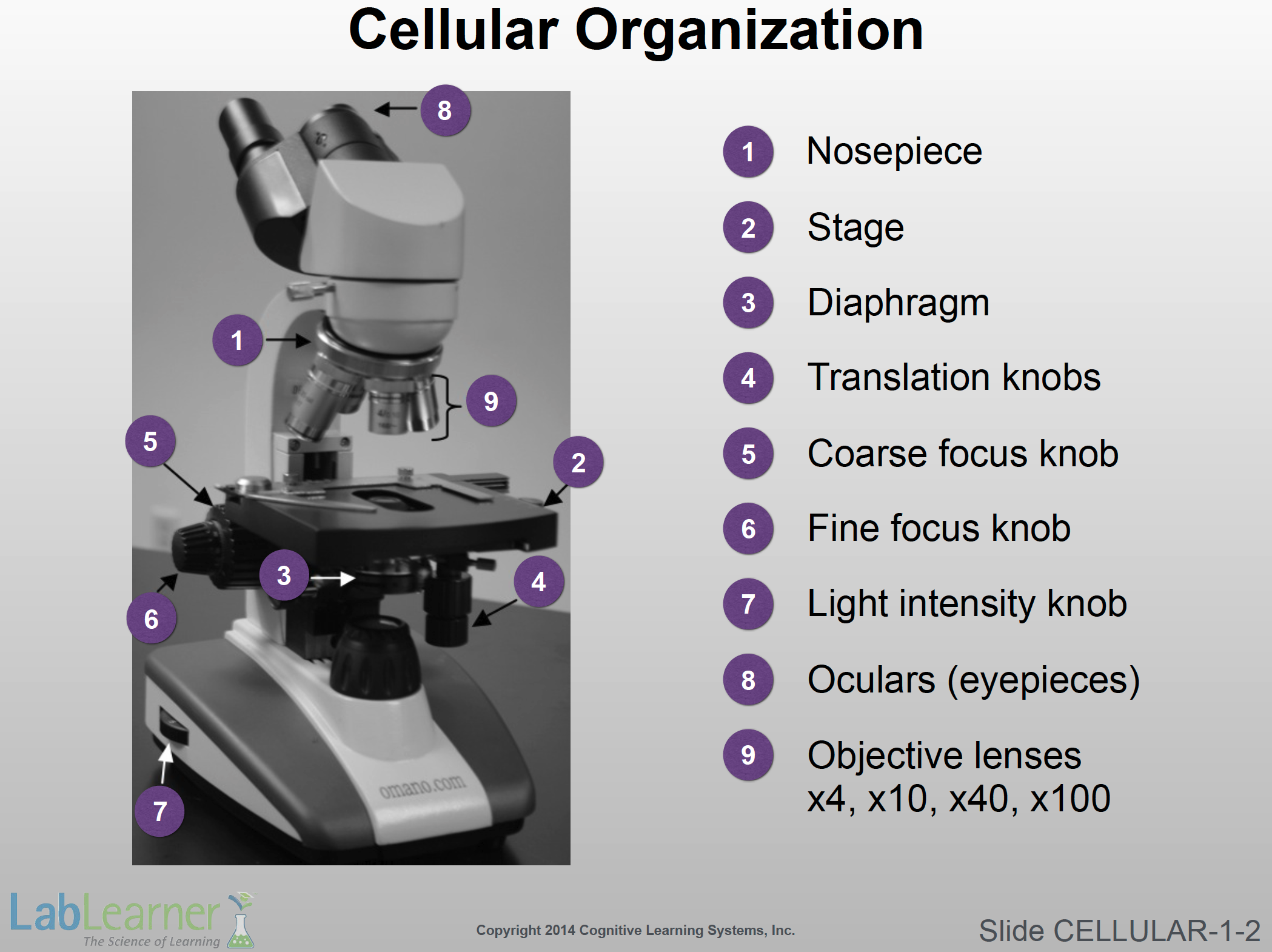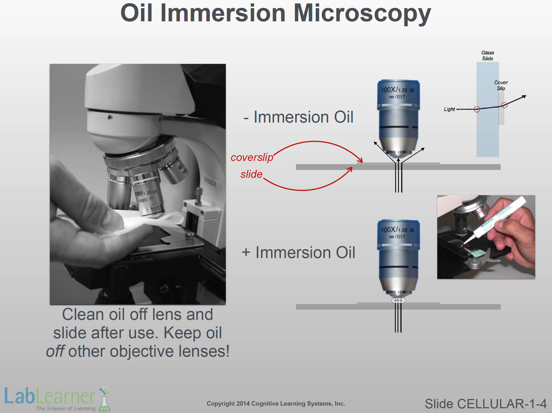 - This slide shows the “anatomy” of the binocular oil immersion microscope. LabLearner uses slightly different models of microscope depending on availability and new innovations. While your particular microscopes might look slightly different from the one pictured here, each and every part that is relevant is virtually the same on all of our “scopes”. Let’s consider the essential components of the microscope separately.