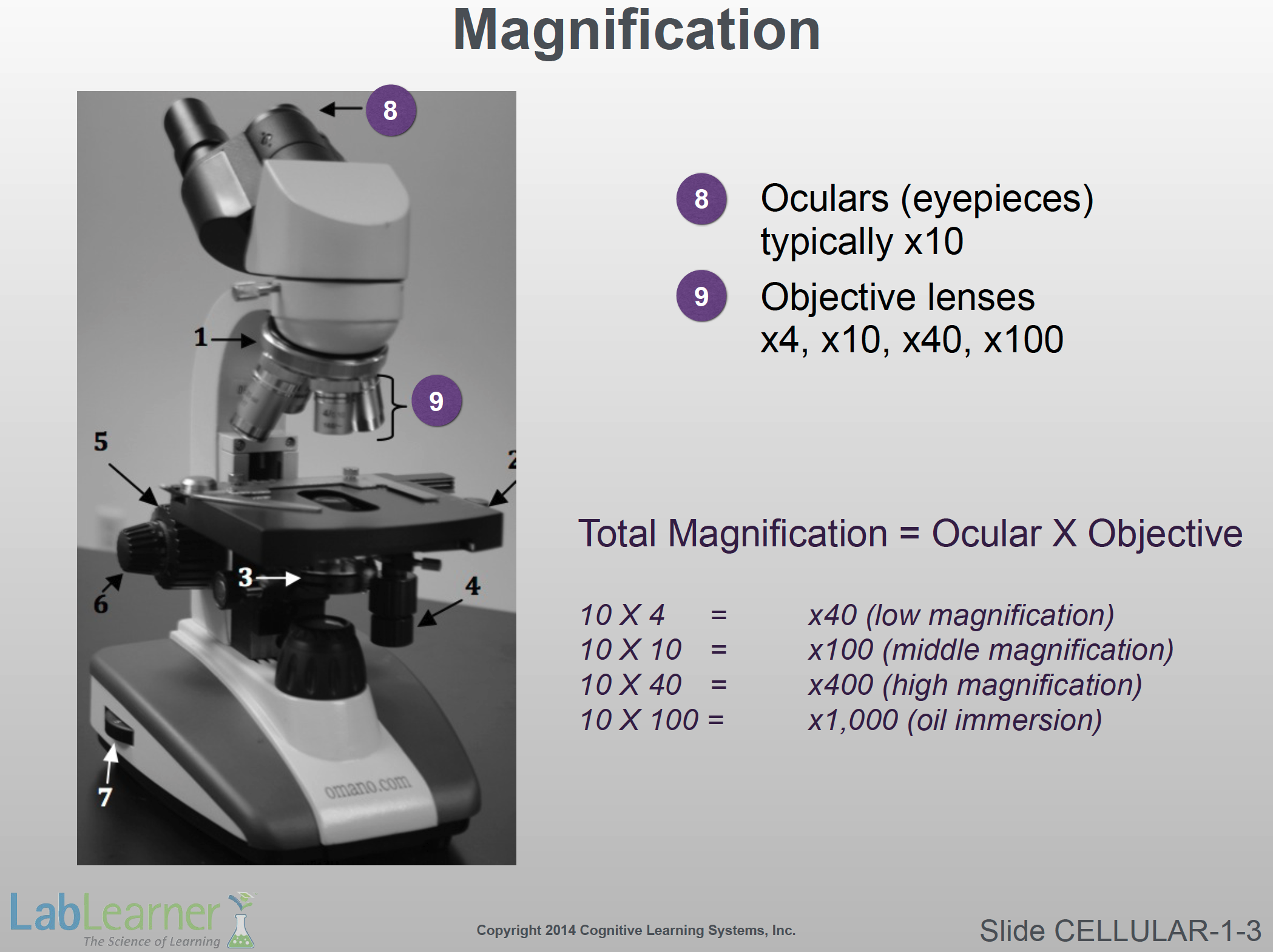 - Objective lenses: LabLearner middle school microscopes come with four objective lenses (x4, x10, x40, and x100). Multiplying the power of the particular objective in use times the power of the eyepiece (x10 for LabLearner microscopes), gives the final magnification at which the specimen is viewed. Thus, each specimen can be view at x40, x100, x400 or x 1,000.