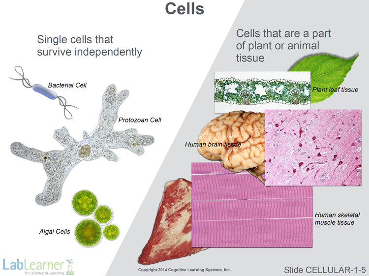 - This slide initiates the discussion of cells. At this point, we highlight a major distinction between types of cells. On the left are examples of cells that exist as independent units. There are many more examples but those shown here include bacteria, protozoans (Amoeba in this case), and algae. Algae are plants and Amoebae are animals. Bacteria are prokaryotes.
