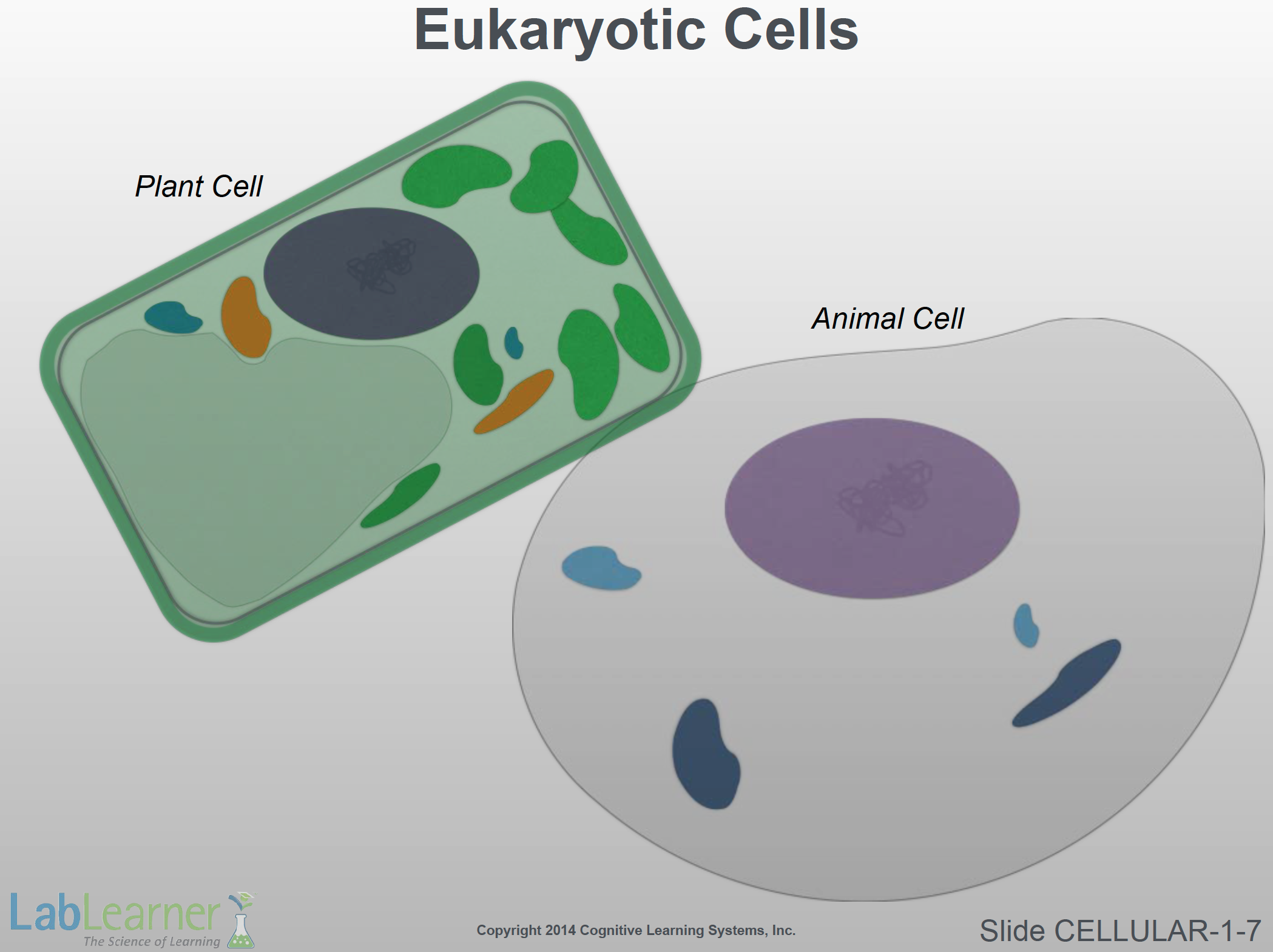 This slide shows idealized examples of plant and animal cells. Both are eukaryotes. We will discuss the nature of the subcellular structures in later Investigations in this CELL. For now, notice that eukaryotes are distinctive from prokaryotes: