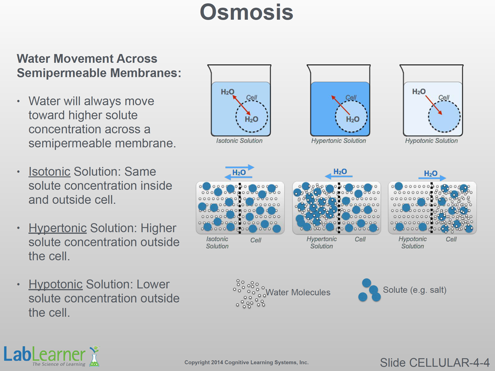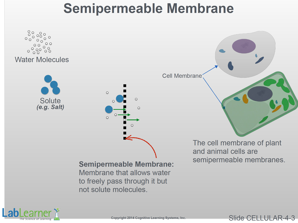 - This slide introduces the extremely important concept of a semipermeable membrane. As shown in the center illustration, a semipermeable membrane allows water molecules to freely pass through it. Solute molecules, on the other hand, are not able to pass through the semipermeable membrane.