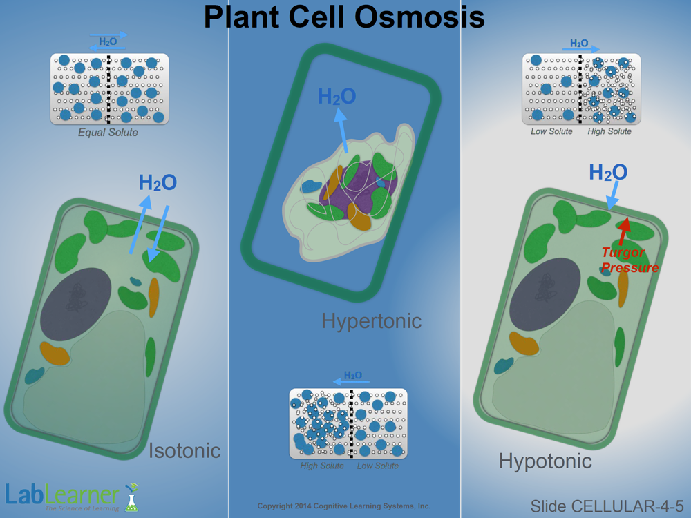 - This slide shows what can actually happen to a plant cell in isotonic, hypertonic and hypotonic solutions. As shown, no net water movement occurs under isotonic conditions. The arrows show that water may move across the semipermeable cell membrane, but as much water that enters the cell, the same amount exits.