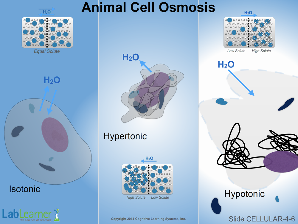 - This slide shows what can actually happen to an animal cell in isotonic, hypertonic and hypotonic solutions. As shown, no net water movement occurs under isotonic conditions. The arrows show that water may move across the semipermeable cell membrane, but as much water that enters the cell, the same amount exits.
