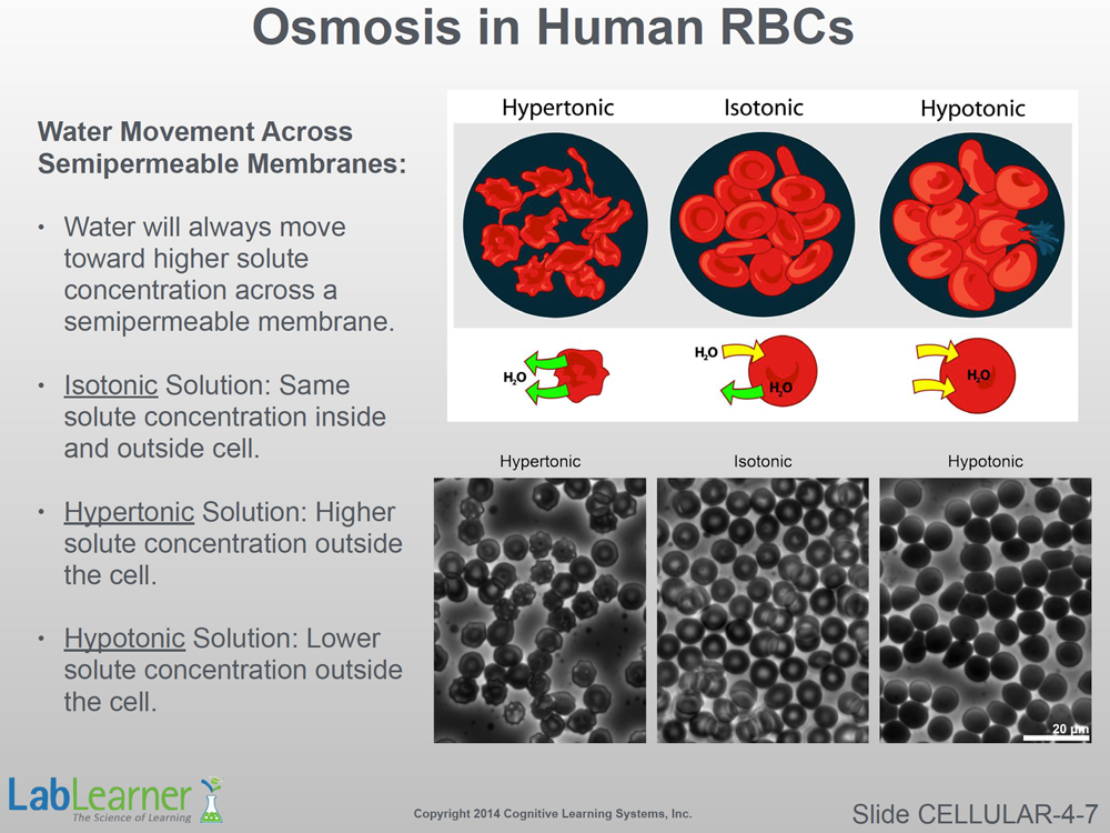 - This slide simply repeats the information from the previous slide but is specific for human blood cells. The degree of hypotonicity to which human blood cells can withstand before lysing is a function of the strength of their cell membrane and its supporting structures.