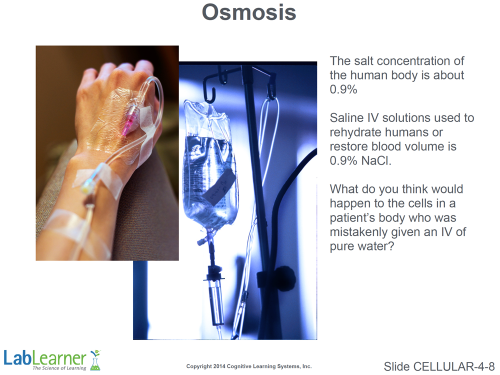 - The slide asks the question, “What do you think would happen to the cells in a patient’s body who was mistakenly given an IV of pure water?” This would, of course, be very bad. Cells throughout the body would begin to swell and eventually lyse!