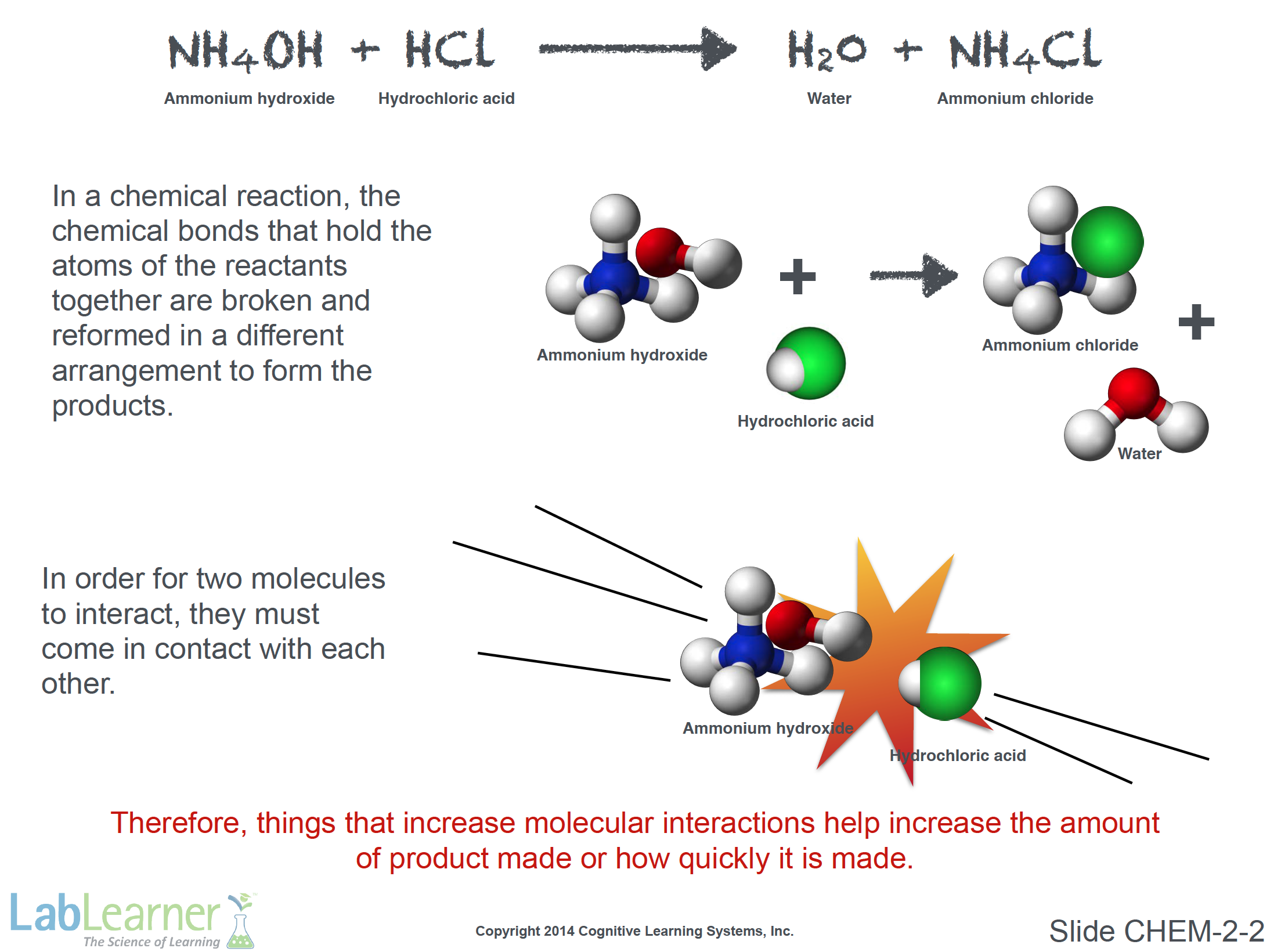 - Inform students that this slide uses the reaction from Investigation 1 Lab, the reaction between ammonium hydroxide and hydrochloric acid to yield water and ammonium chloride.