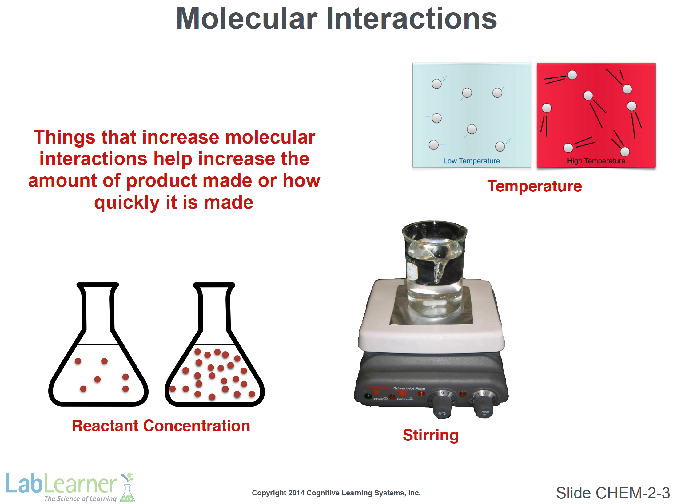 - Explain that both stirring and increasing temperature increase the kinetic energy of the reaction, thus increasing molecular motion and the rate at which reactant molecules collide and interact with each other.