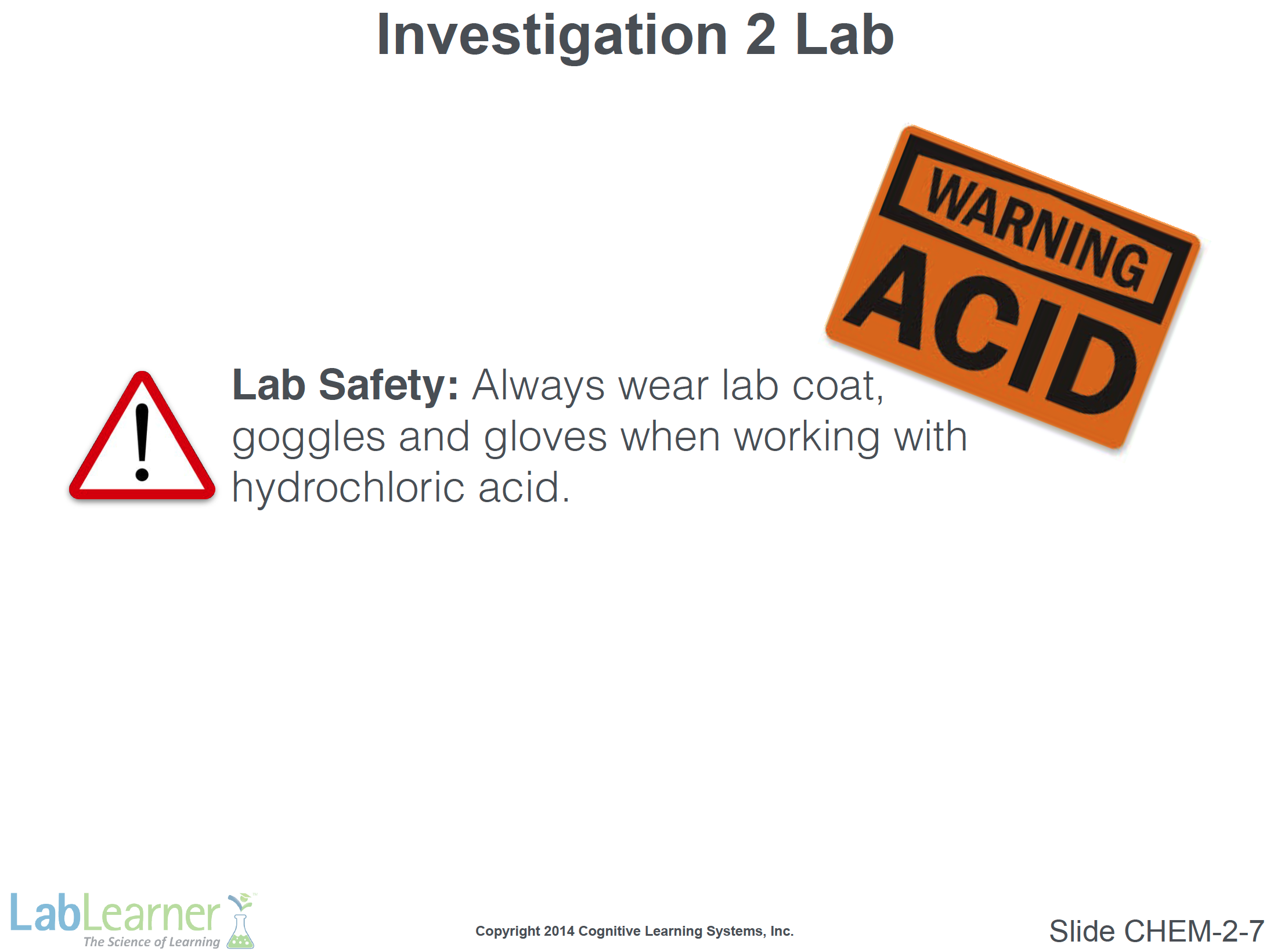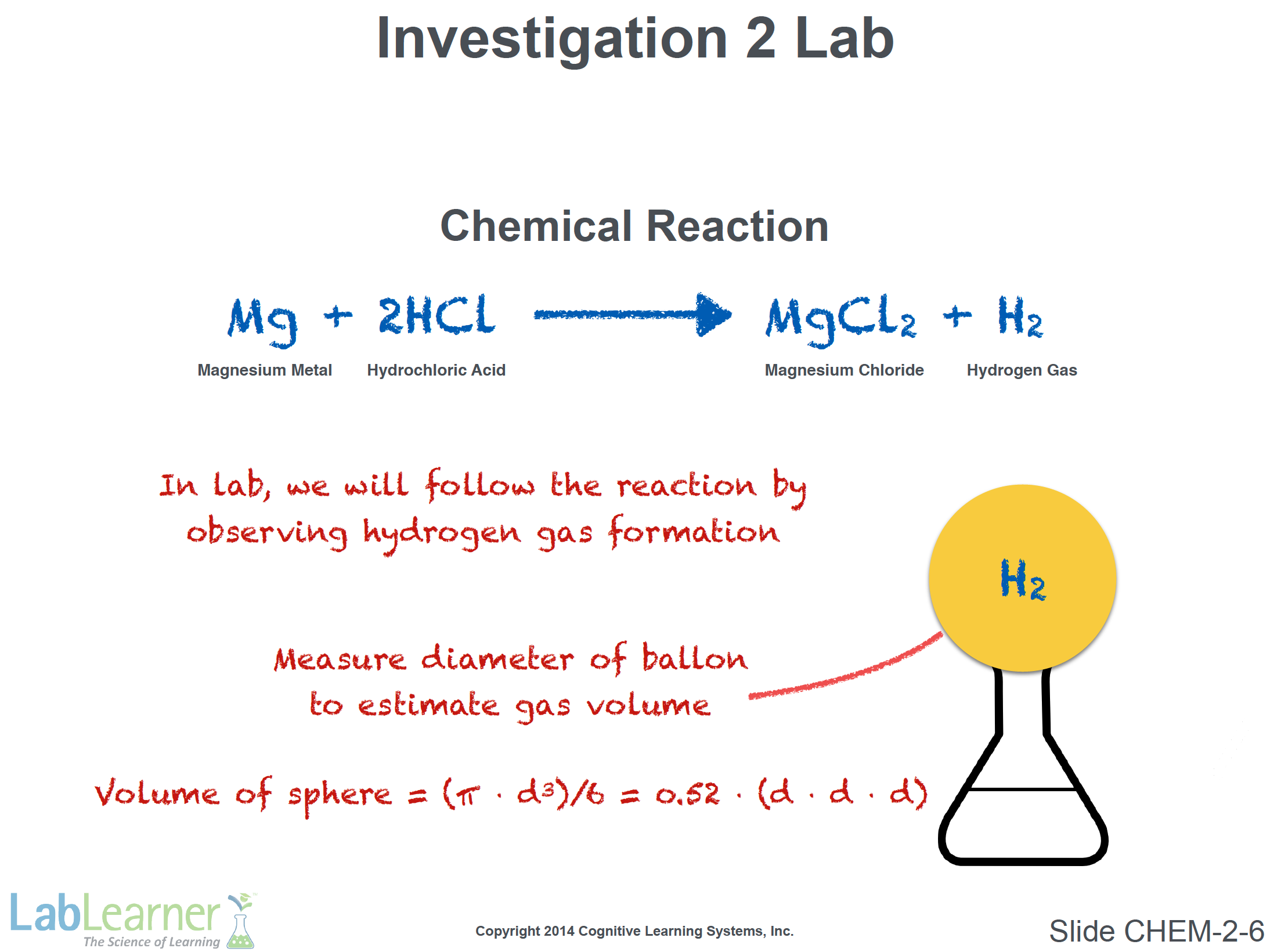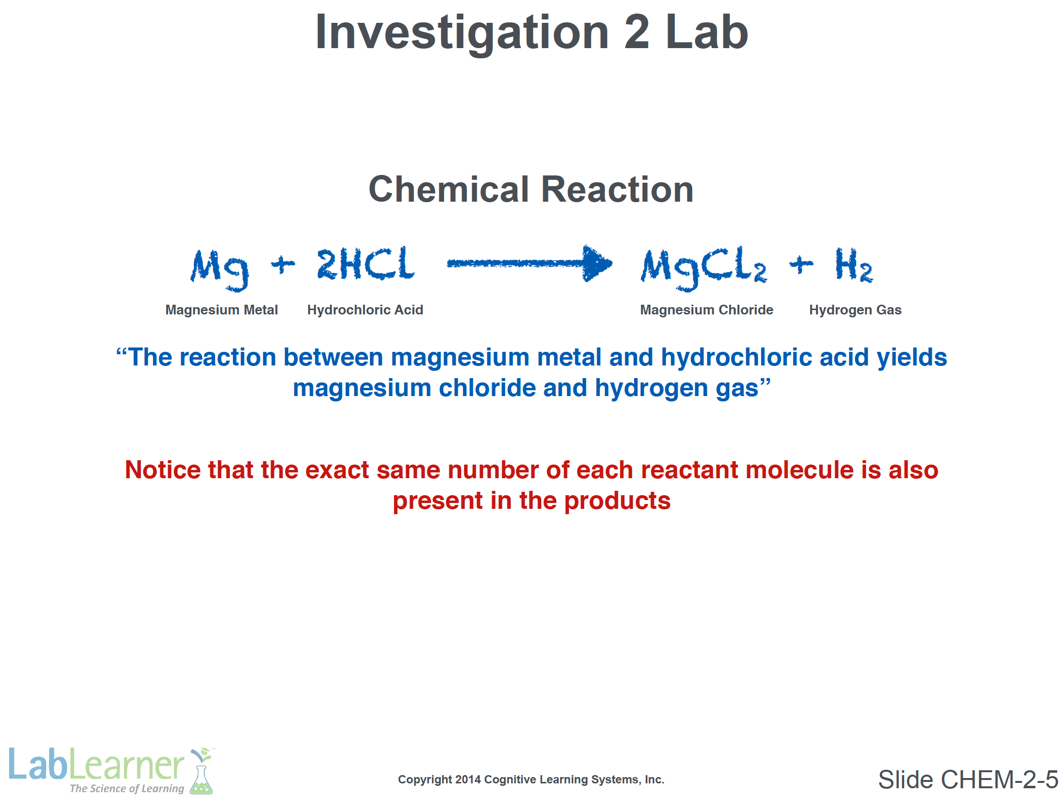 - Inform students that this slide simply introduces the chemical reaction that will be studied in the Lab in Investigation 2.