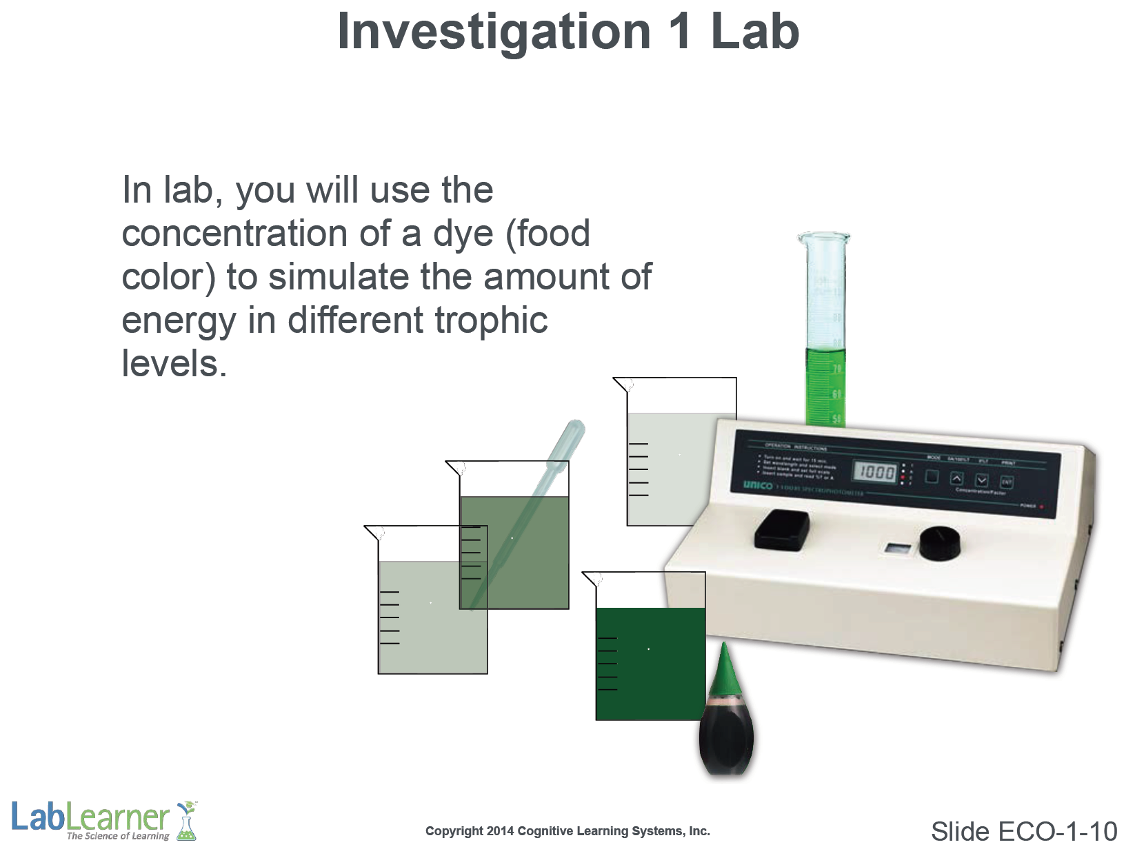 - This final slide simply depicts the model of energy flow through trophic levels that we will address in Investigation 1 lab. In the lab, a dye will be added to water to represent the amount of energy reaching an ecosystem from the Sun. As this energy moves through the trophic levels of a system, it becomes more and more dilute.