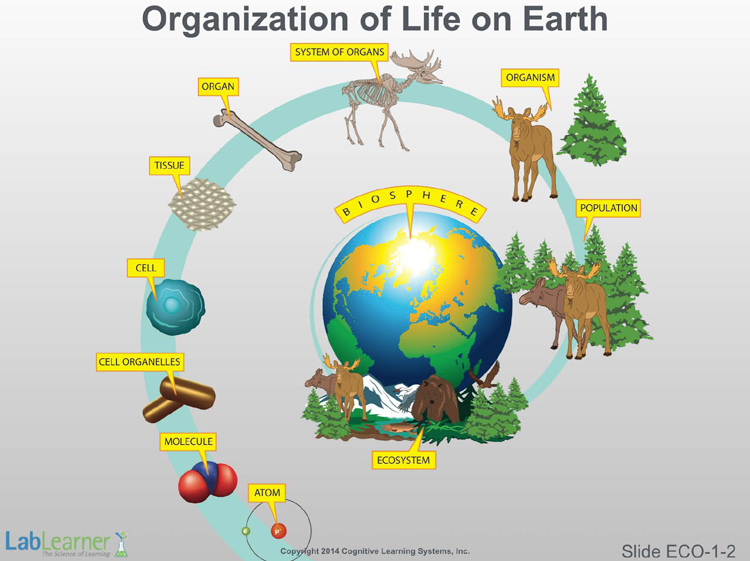 Note: In this first Investigation of the Ecosystems CELL, we wish to establish several basic concepts. First, we will briefly discuss the organization of life on Earth. That molecules make up cell structures and that cells organize to form tissues and so on. Eventually, such organization builds to entire populations of plants and animals that interact with the physical components of the world around them in complex ecosystems.