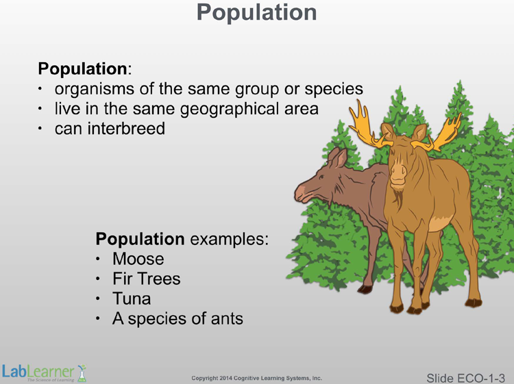 - The new information in this slide begins at the “population” level. Individual organisms never exist entirely alone. Without breeding populations, a species would not reproduce and therefore would become extinct in a generation. Even if individuals lead relatively solitary lives, they must gather periodically in order to reproduce the next generation. The individuals that do so within a given geographic range are called a population.