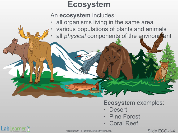 Note: This slide focuses the discussion on the ecosystem level. It should accentuate that an ecosystem not only encompasses the many plant and animal populations in a given geographic area but also the physical components of the environment as well.