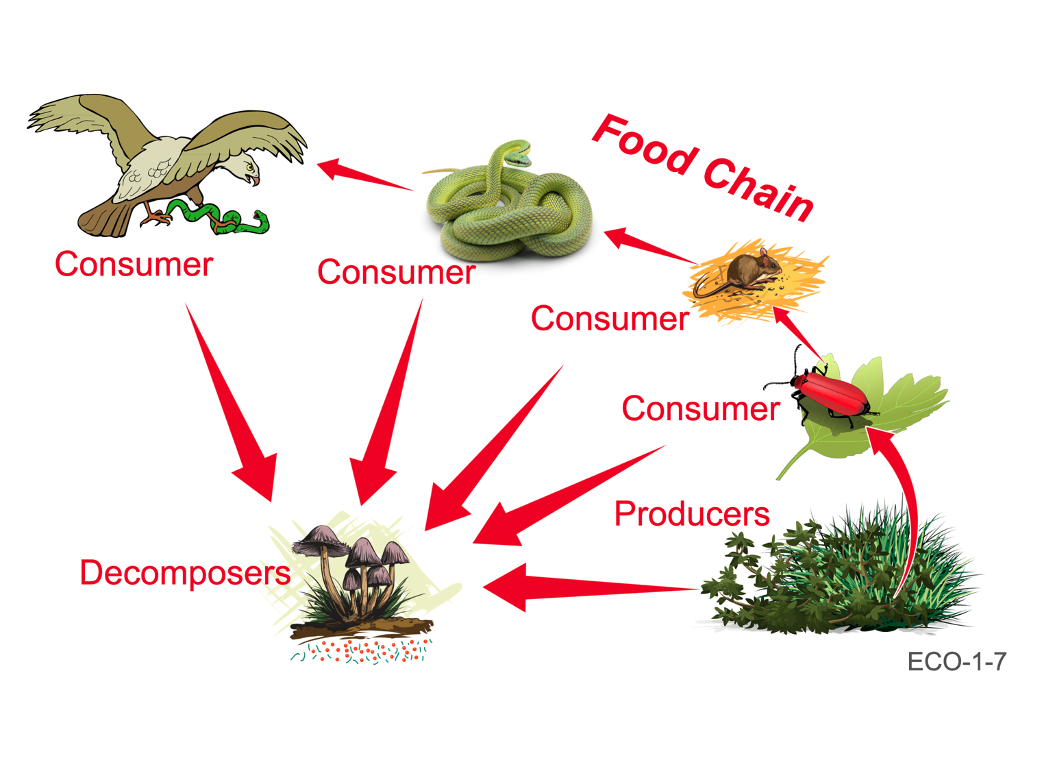 - This highly simplified slide introduces the concept of a food chain. It is simple because it suggests that one type of insect eats plants and is eaten by only one type of rodent. The snake is shown to only eat rodents and the bird of prey eats only snakes. In the real world, each of these levels may feed on a variety of other organisms and, in turn, may be preyed upon by many different organisms. Thus, a simple food chain as shown here, quickly expands into a food web, with many predatory relationships described.