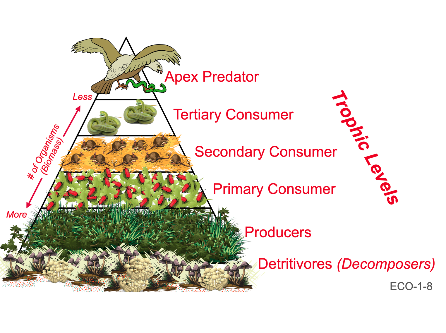 - Finally, notice that at each trophic level there are fewer and fewer organisms and “biomass”. Biomass is a measurement of the dry weight of organisms. This decreasing number of individuals and their associated biomass is what gives the pyramid its shape in such models.