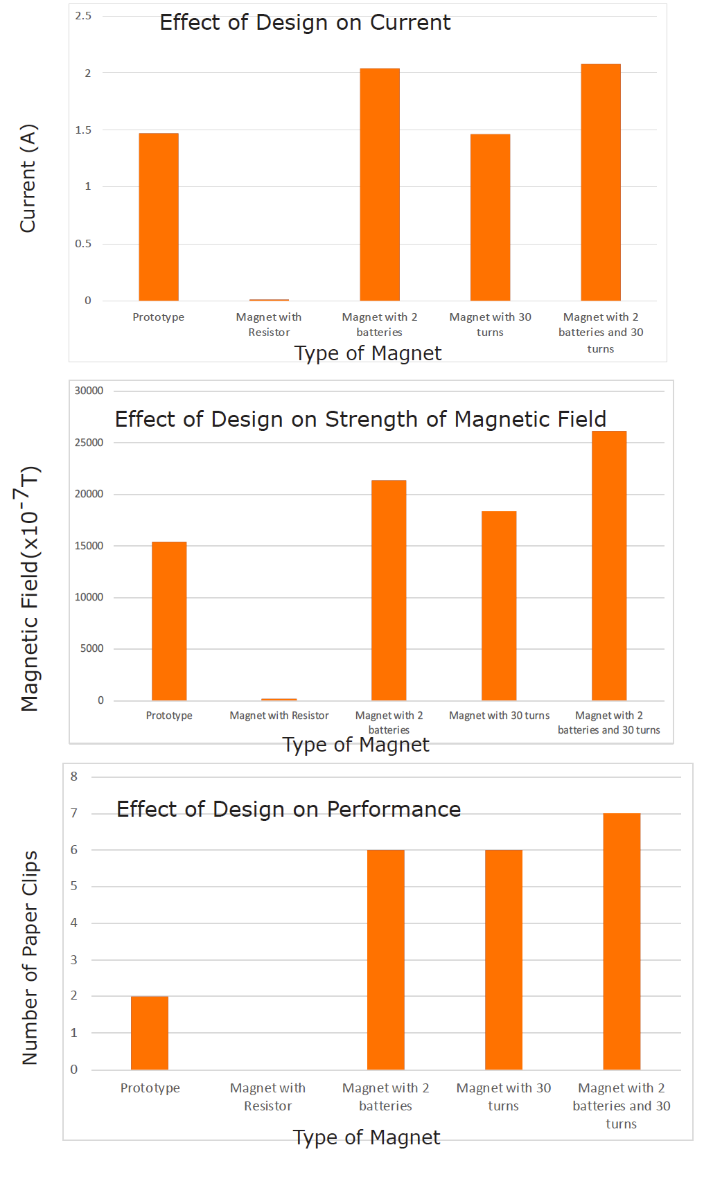 The two stronger magnets were also successful. The electromagnet with two batteries increased the current of the magnet as compared to the prototype as shown by the changes in current in the graph above. The magnet with two batteries had a current of 2.04 A, which was greater than the 1.47 A of the prototype. The stronger magnet was able to hold 4 paper clips, 2 more than the prototype magnet. In addition, the strength of the magnetic field was 21360 × 10-7 T as compared to 15392 × 10-7 T with the prototype.