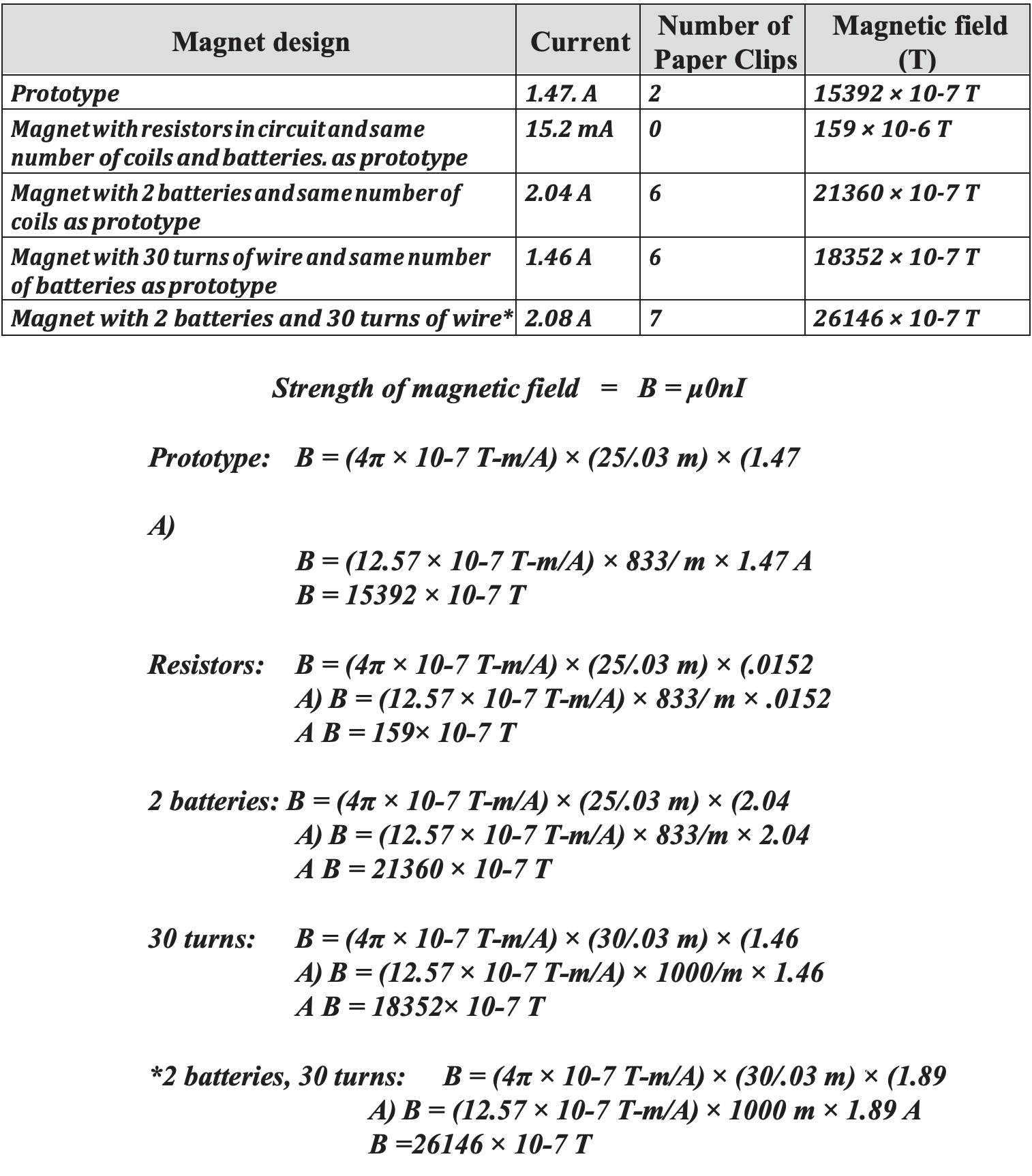 Note: Increasing the number of turns of wire as well as increasing the number of batteries also had a positive effect on the performance of the magnet. The magnet with 30 turns of wire and 2 batteries had only 2.08 A of current compared to the prototype’s 1.47 A, but was able to pick up 5 more paper clips than the prototype. In addition, the strength of the magnetic field was 26146 × 10-7 T compared to the 15392 × 10-7 T of the prototype.