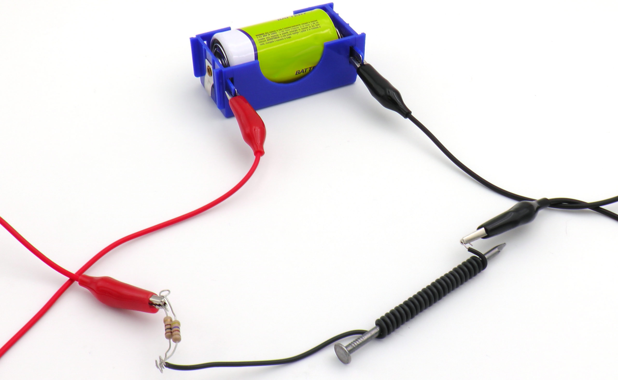 1. Direct one student from each group to obtain the following materials from the central distribution center: two (2) alligator test leads, one (1) 100 cm piece of wire, one (1) multimeter, one (1) nail, two (2) batteries, two (2) battery joiners, one (1) 100 Ω resistor, one (1) 470 Ω resistor, one (1) 1000 Ω resistor, and twenty (20) paper clips.