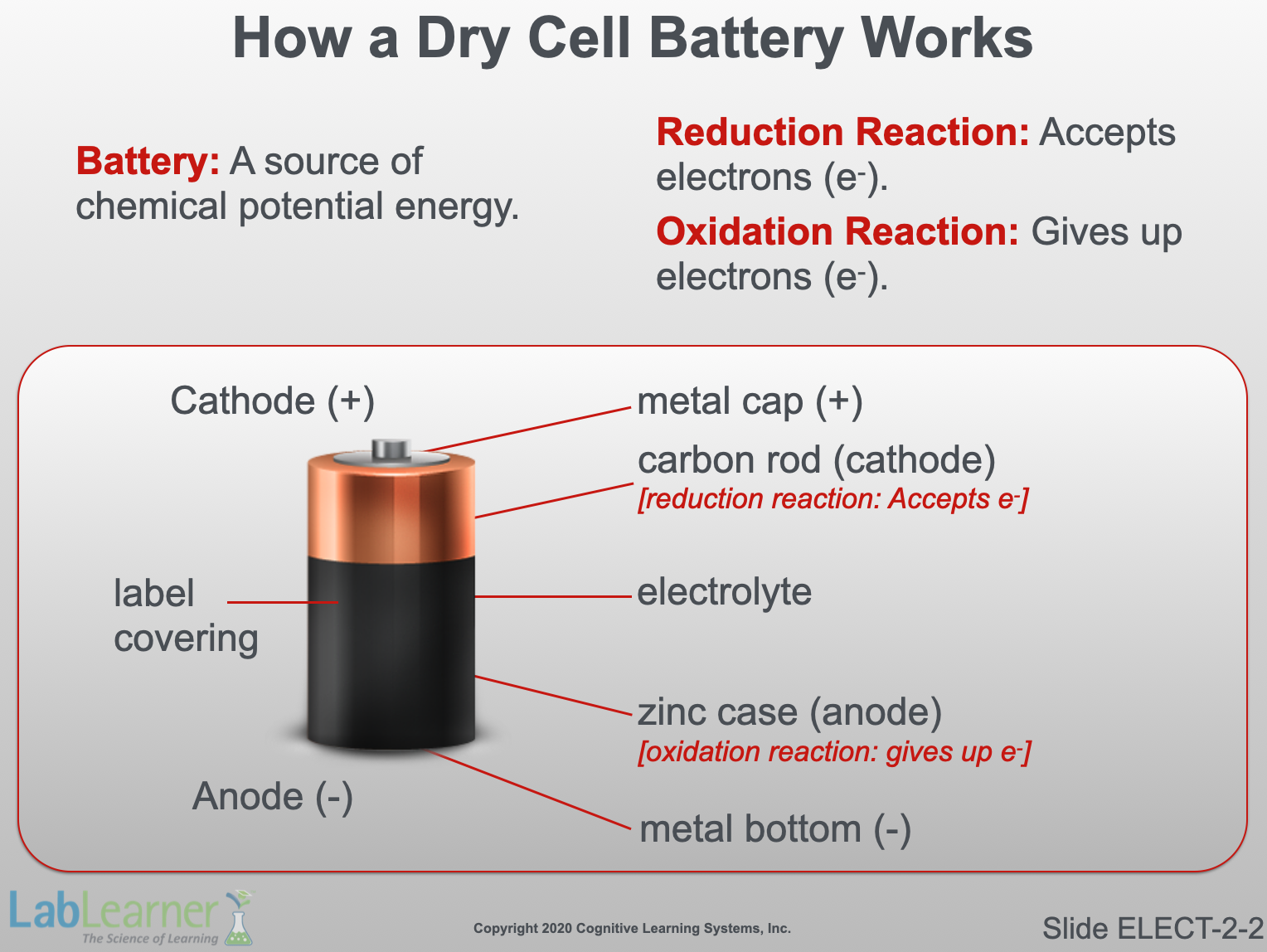 Also at the top of the slide, reduction and oxidation reactions are briefly defined. In the simplest of terms, a reduction reaction accepts electrons (e-) and an oxidation reaction gives up or donates, electrons. As we will see, a battery works by simply controlling the movement of electrons from the oxidation of one chemical (zinc) to another chemical (carbon), which accepts them.