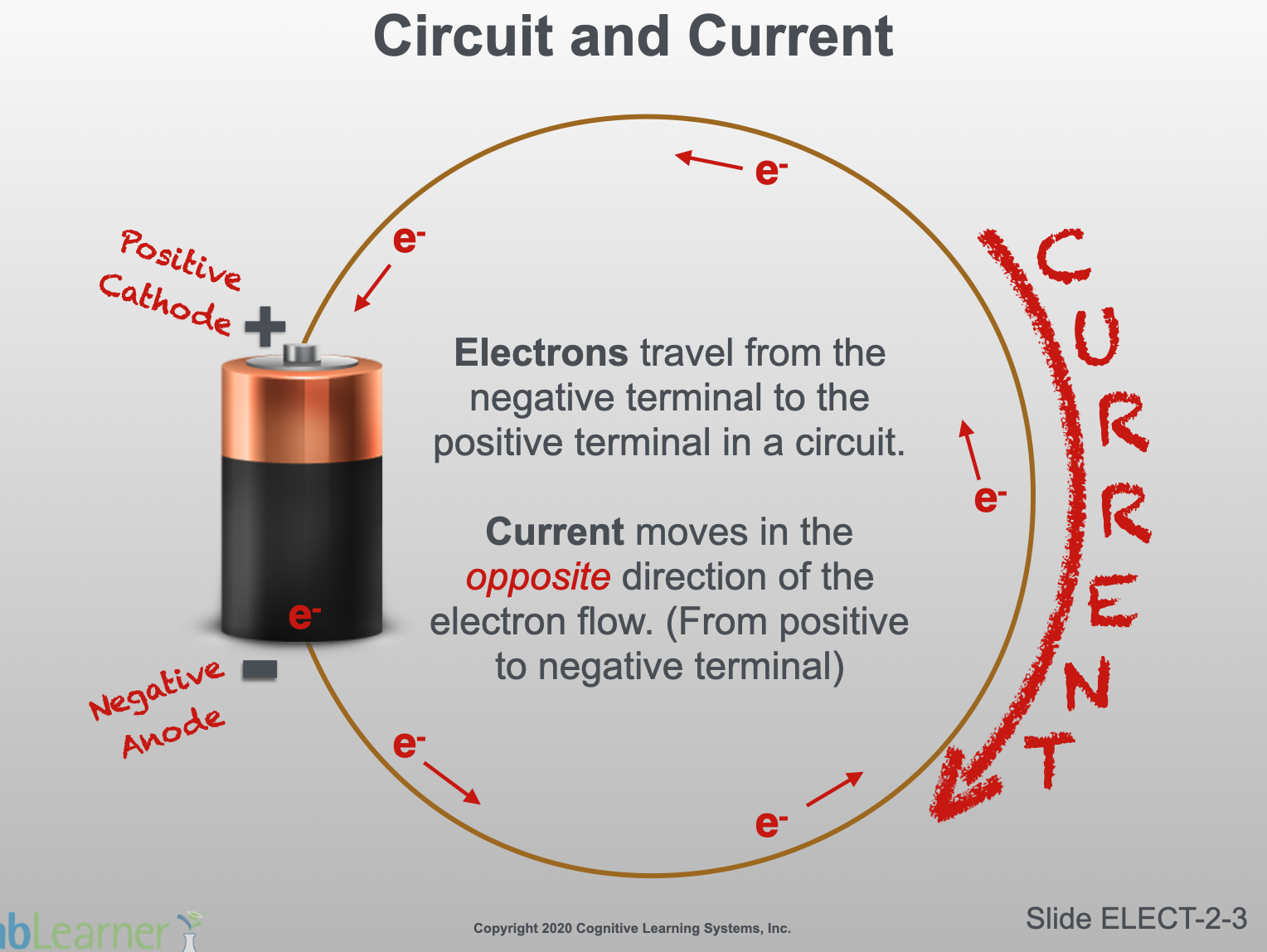 This slide is similar to one seen in Investigation 1. It is used here to show a completed circuit following the discussion of how a battery works on the previous slide.