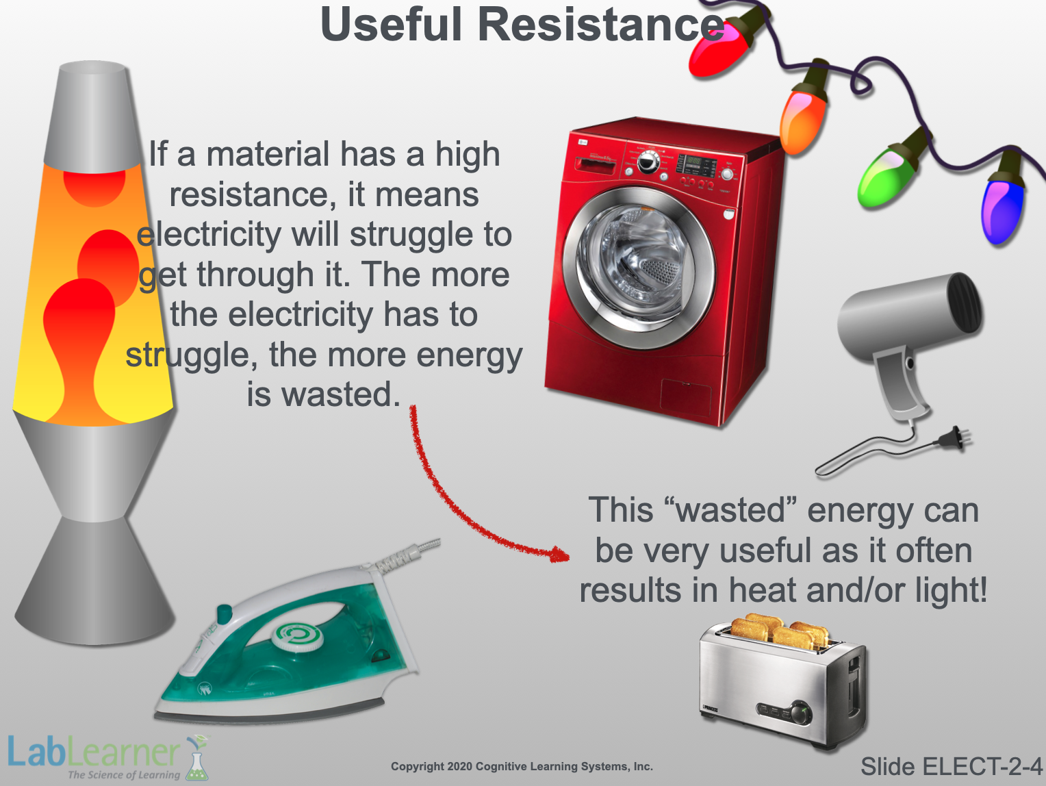 On the other hand, resistance can be controlled and exploited to our advantage in a whole range of electrical devices. Electric ovens, irons, toasters, and driers all use resistance to electron flow to produce useful heat. Resistance can also be used to produce light, as we will see in further detail on the next slide.