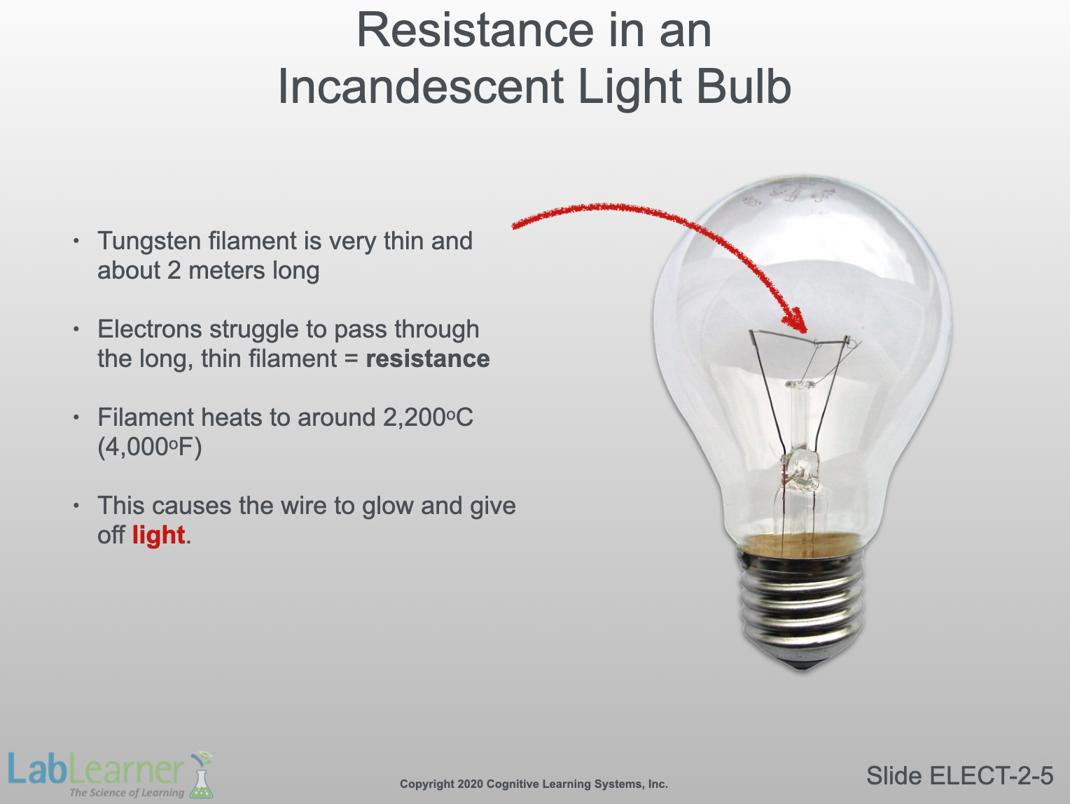 In an incandescent light bulb, a current is forced to pass through the very narrow tungsten wire of the filament. In addition to the narrowness and extended length (about two meters) of the filament, the element tungsten itself has a lower conductivity than copper wire, so it has added resistance for this reason as well.