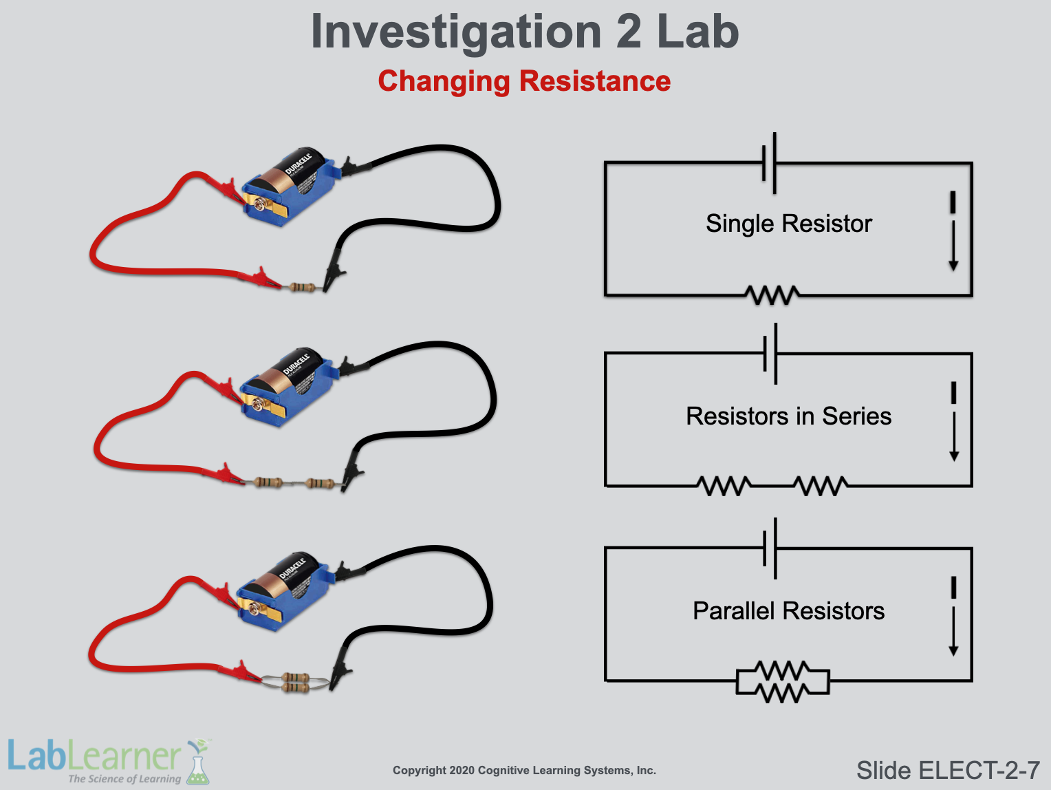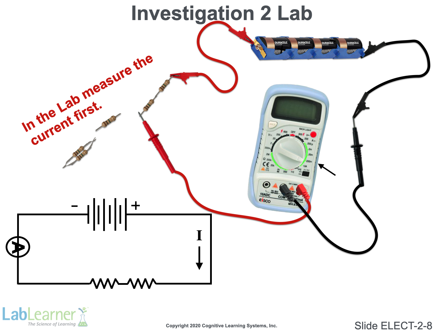 The final two slides show the laboratory setup and schematic drawings of a circuit that students will use in Investigation 2 lab. In this slide, students are shown how to measure current in a circuit while different resistor configurations are tested.