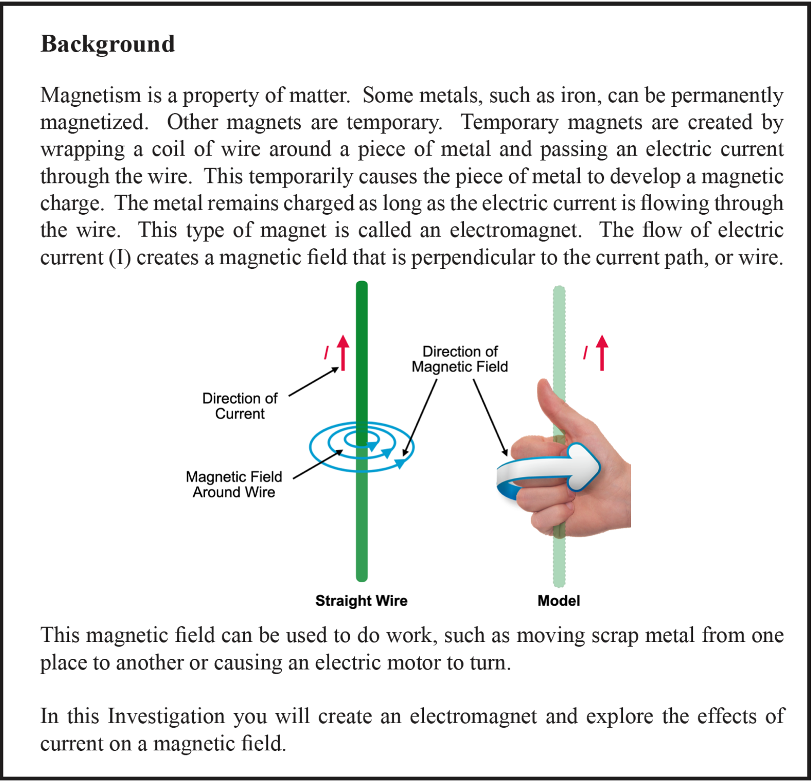 - Inform students that during this Investigation, they will continue their examination of current by studying how current influences the magnetic field of an electromagnet.
