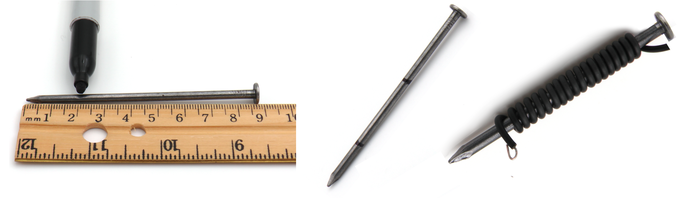 b. Carefully unwrap 5 turns of wire from the nail so that there are 15 turns of wire. Spread the coil of wire to evenly cover the distance between the two marks on the nail.