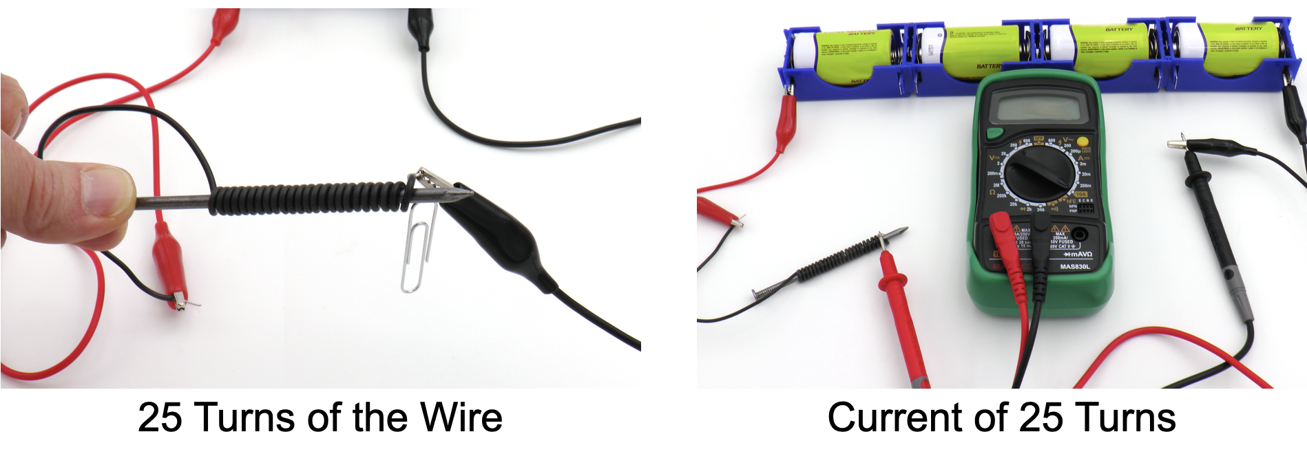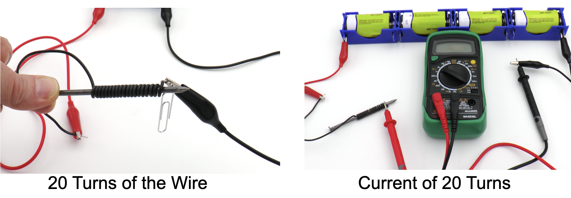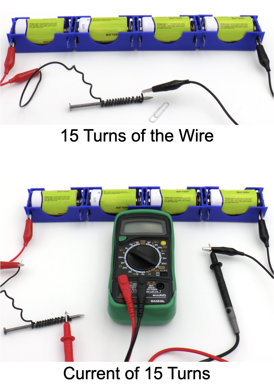 1. Add five additional turns of wire to the electromagnet so that there are 20 turns of wire. Make sure that the coil of wire covers the distance between the two marks on the nail.
