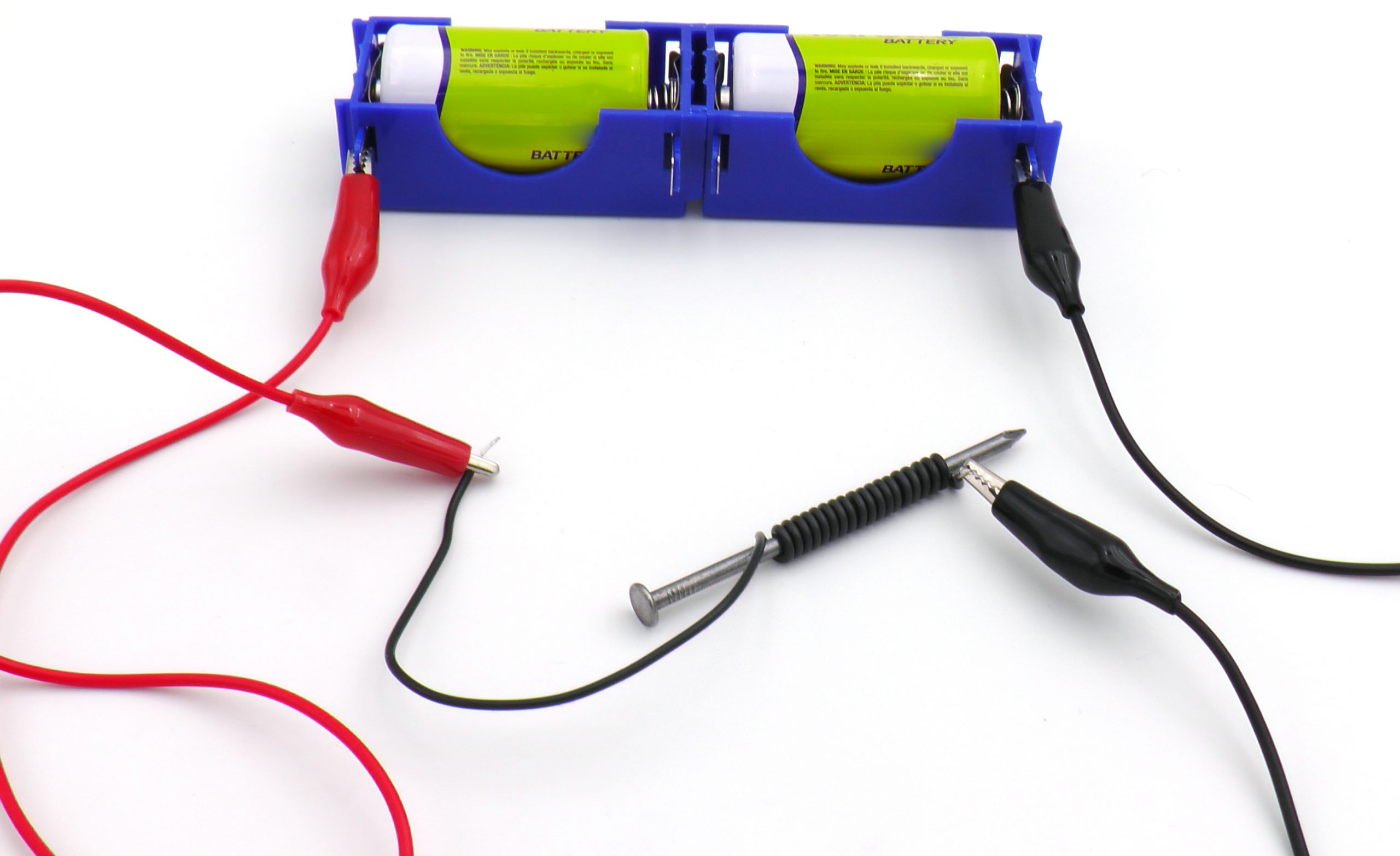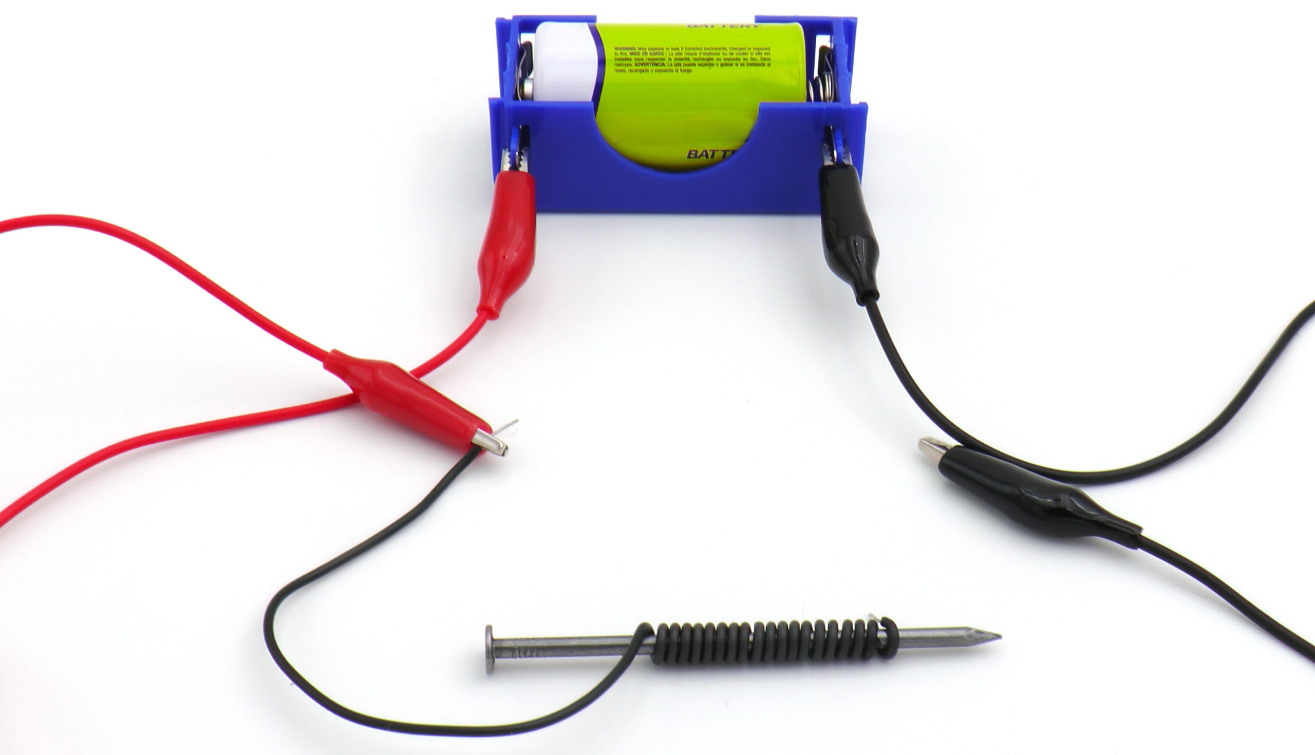 6. Connect the electromagnet to the battery by connecting one end of the wire around the electromagnet to the alligator test lead attached to the positive terminal of the battery joiner.