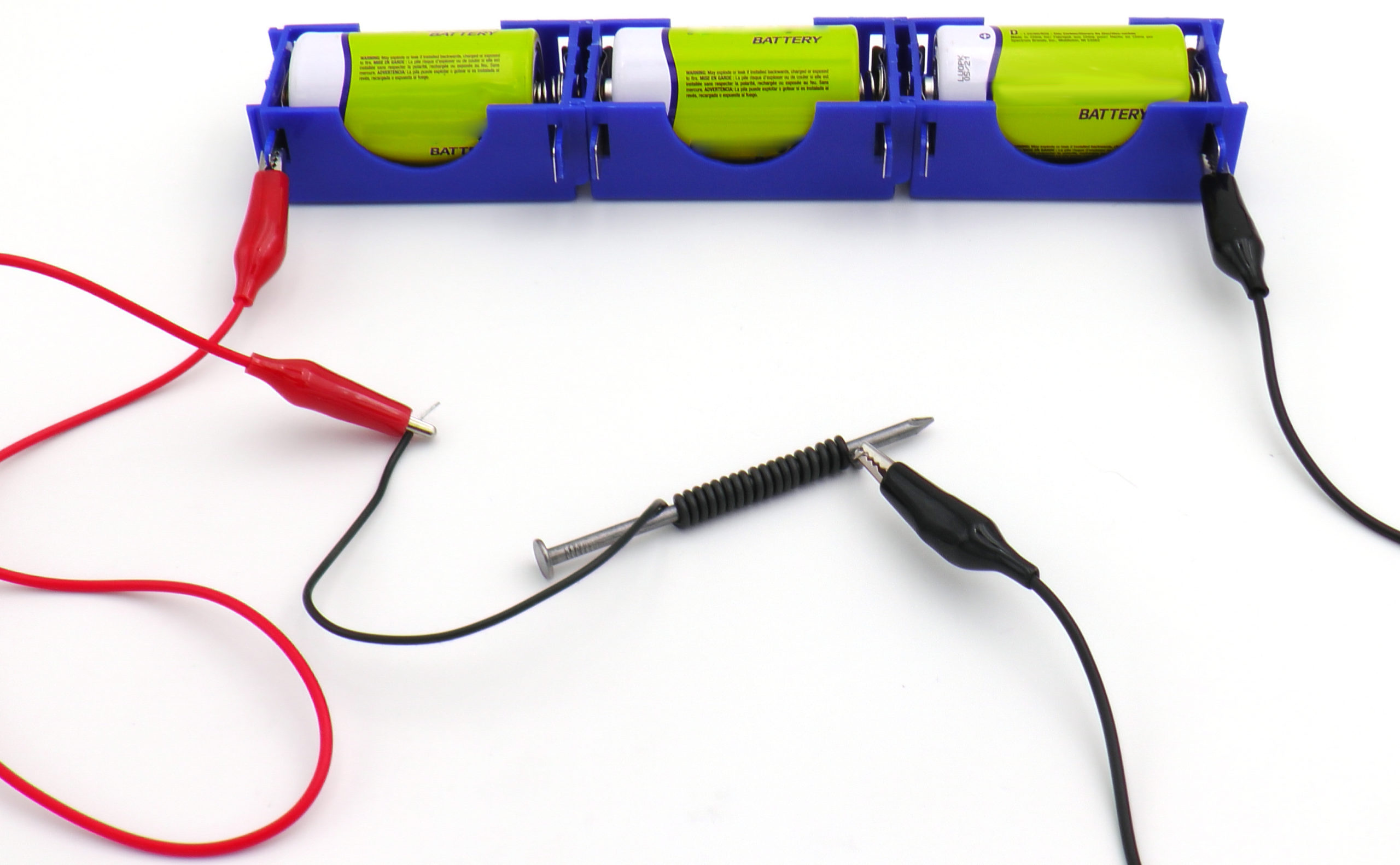 5. Connect the free end of the electromagnet wire to the alligator test lead from the negative terminal of the batteries.