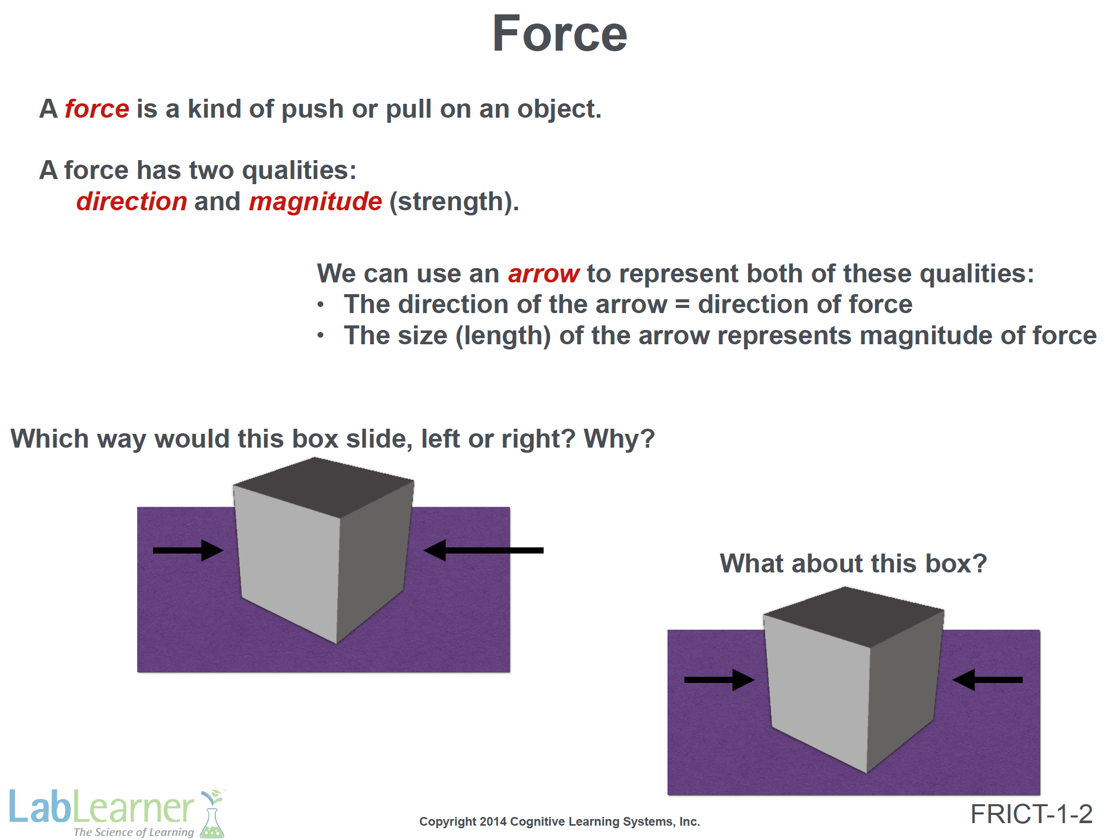 - In the first illustration, the block would move to the left, since the arrow applying force to it from the right is longer than the arrow applying force to it on the left.