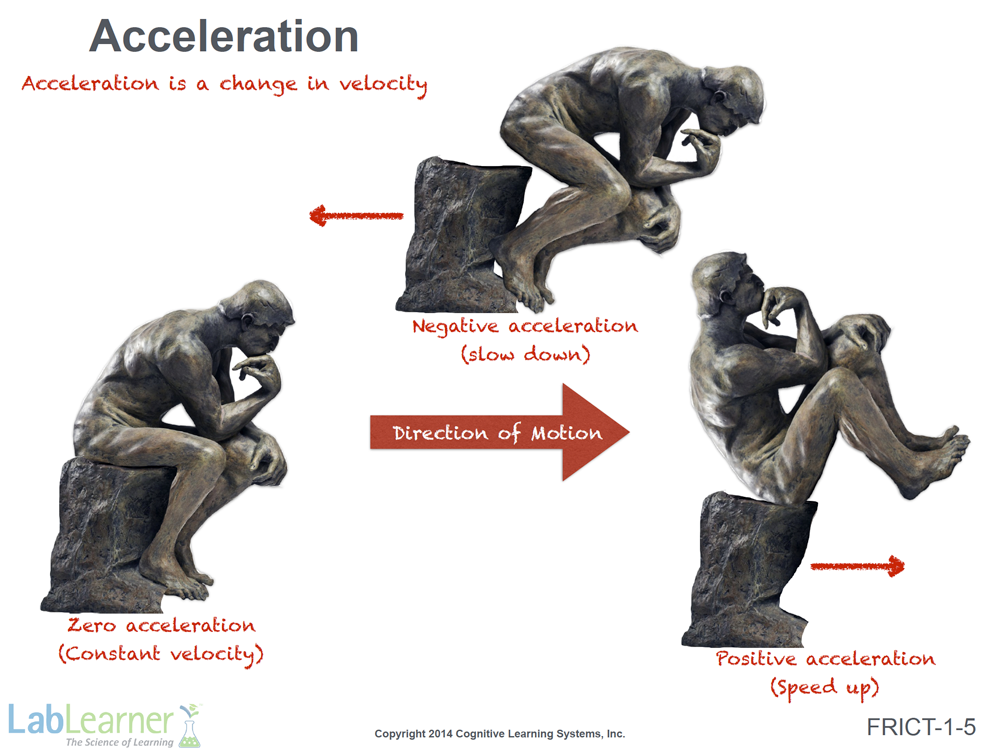 Note: Students often think of acceleration as strictly a force involved in “going faster”. However, negative acceleration is every bit as important as a concept in explaining movement.