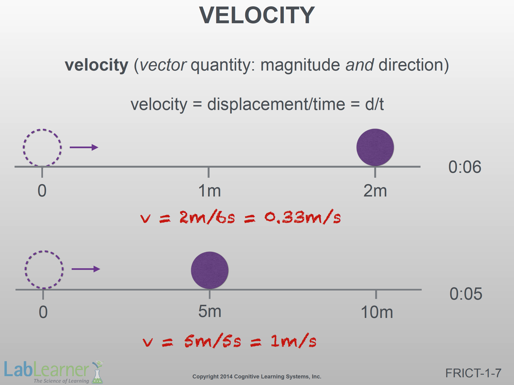 Note: Velocity is displacement divided by time. In the first example on this slide, if the ball rolled to the 2-meter position and then back to the 1-meter position over the 6-second time interval, the total displacement would be only 1-meter and the velocity calculation would give a different answer.